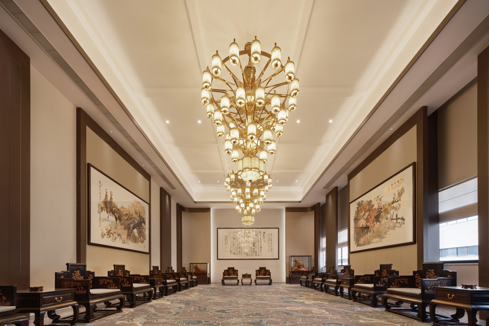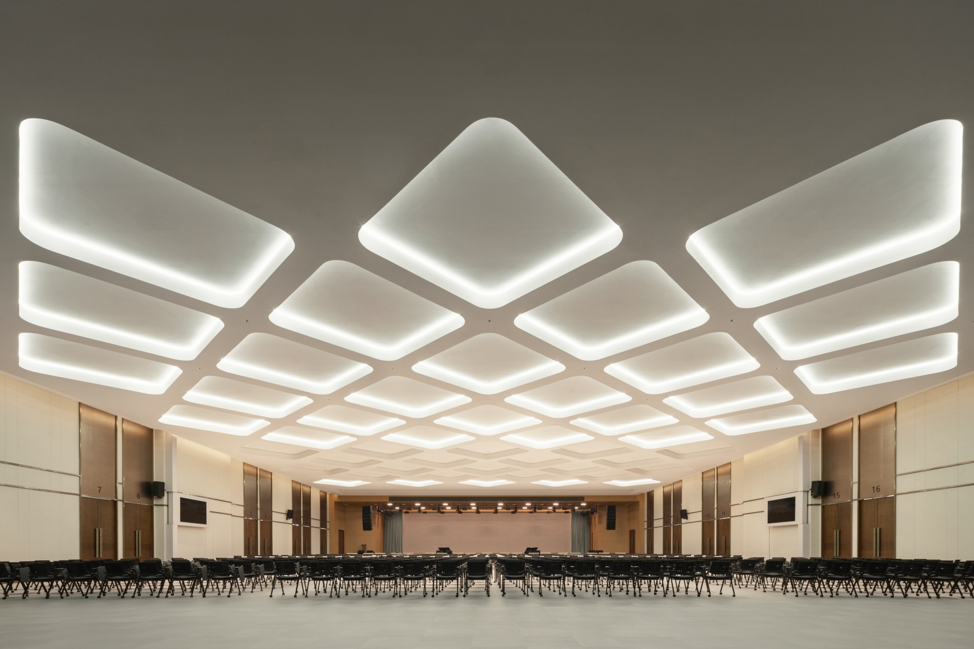 宴会厅与汇报厅:花窗元素与几何灯具呼应古朴美感,千人阶梯式汇报厅通过色彩对比与视野优化提升专业性。