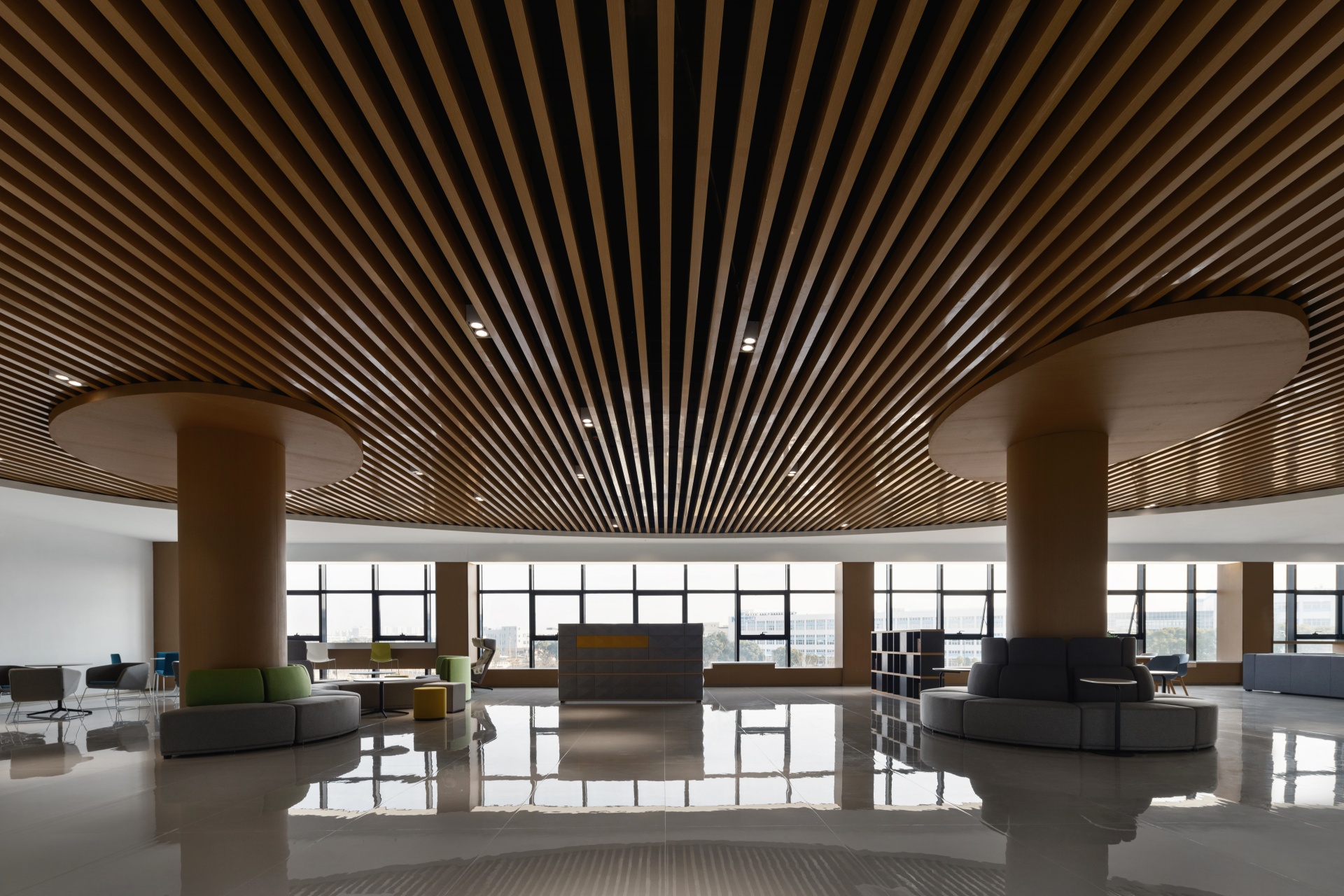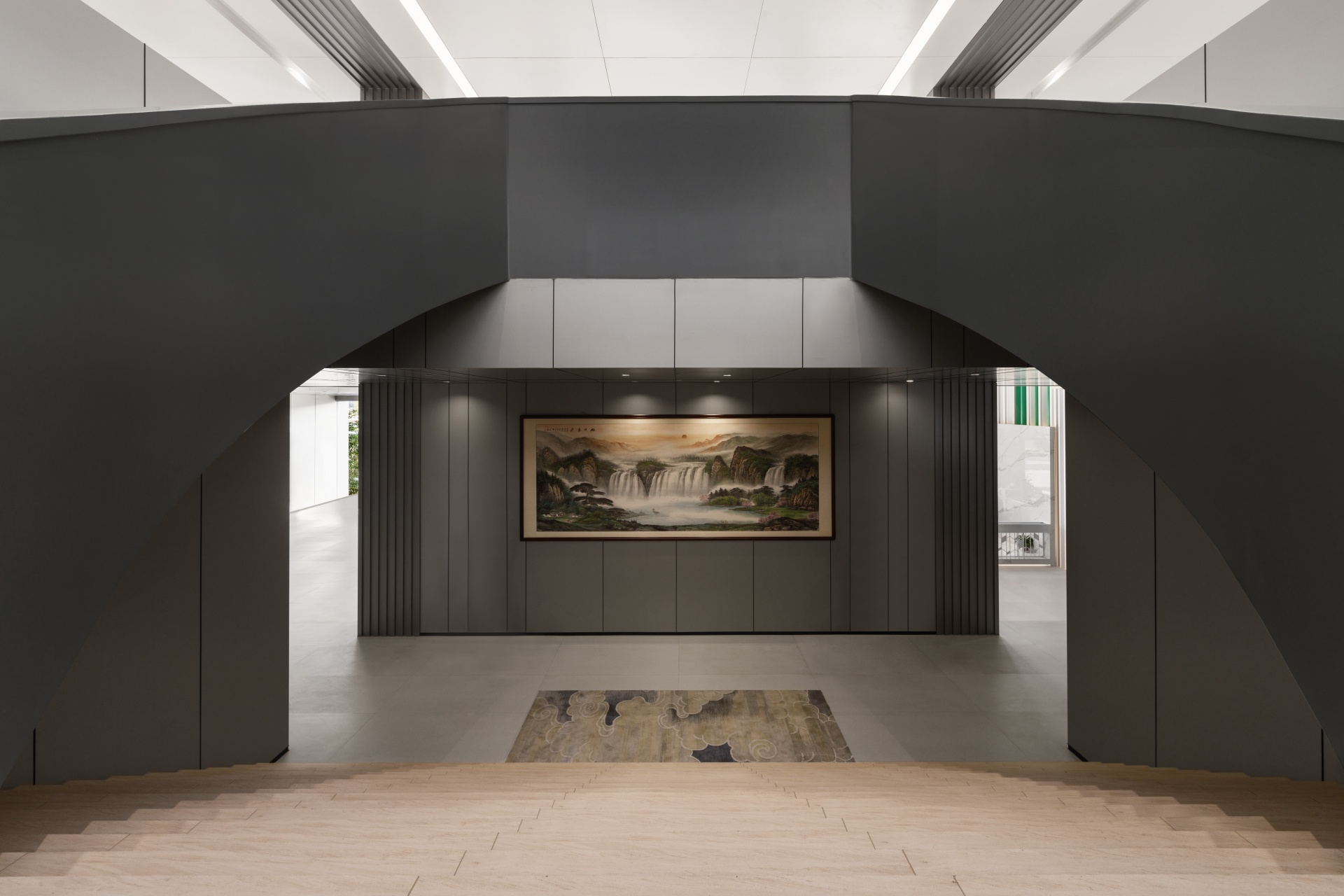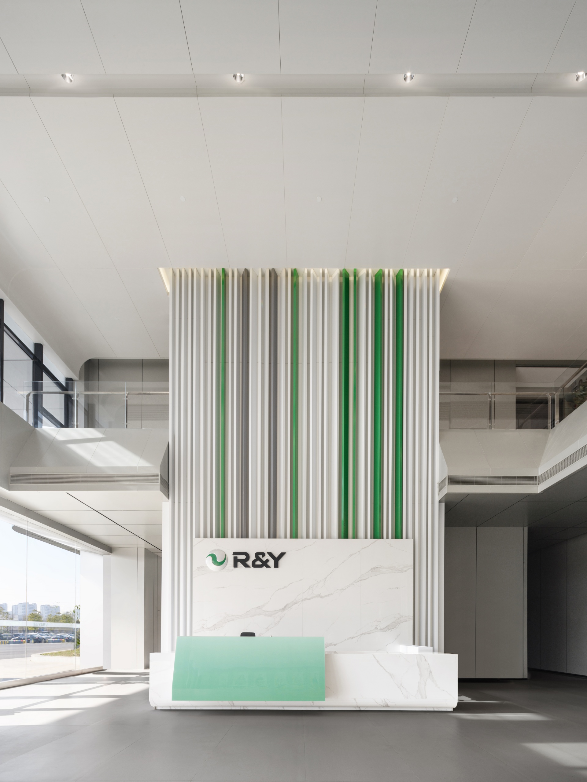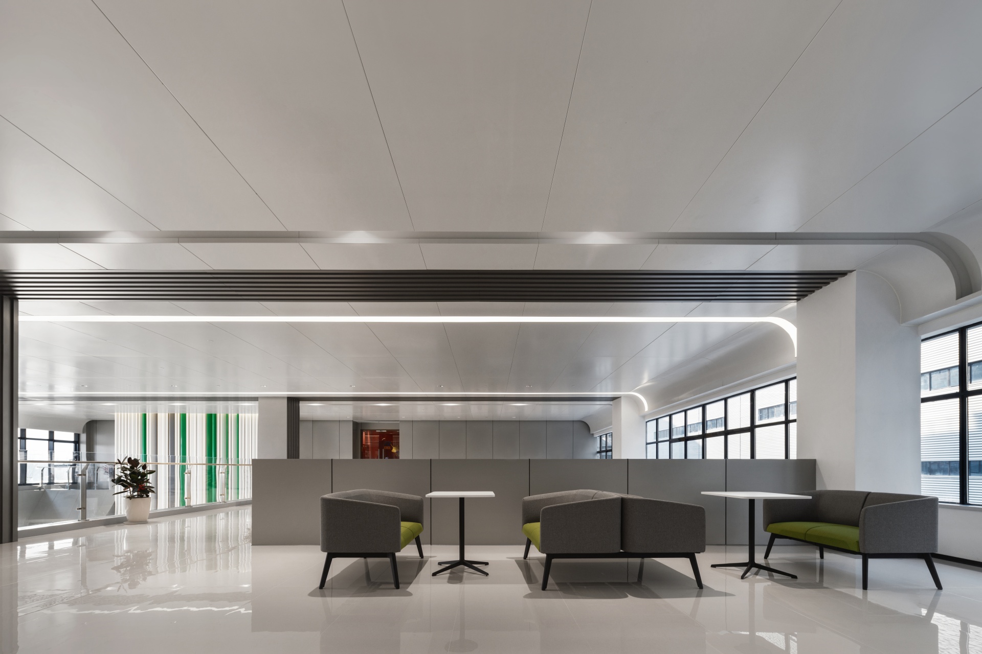 大厅:以灰、绿企业色定调,中岛服务台与开放式旋转阶梯形成对称美学,通透空间强化第一印象的仪式感。