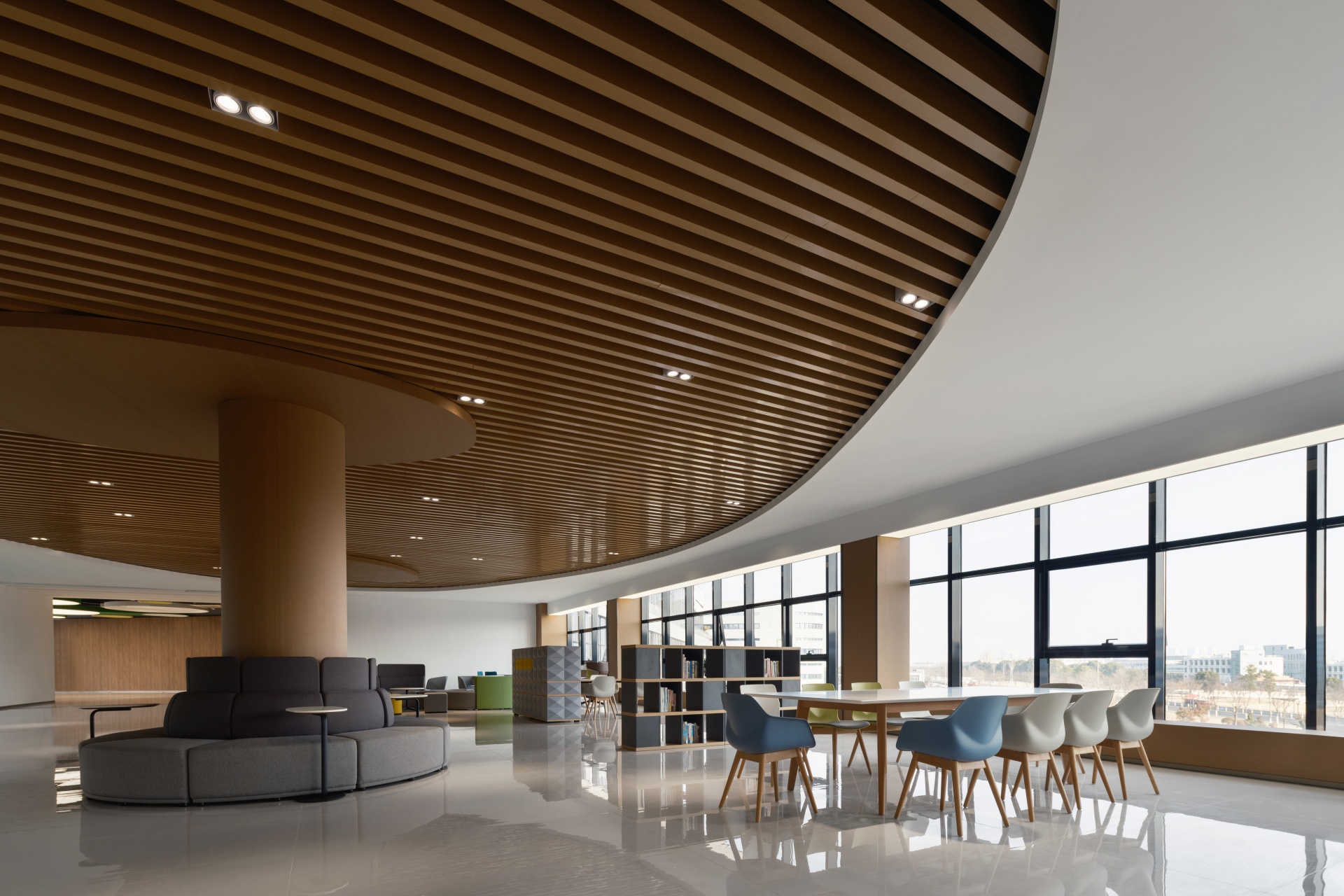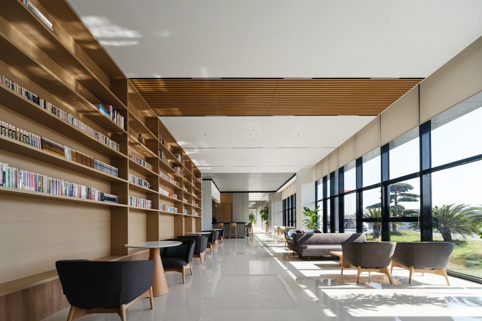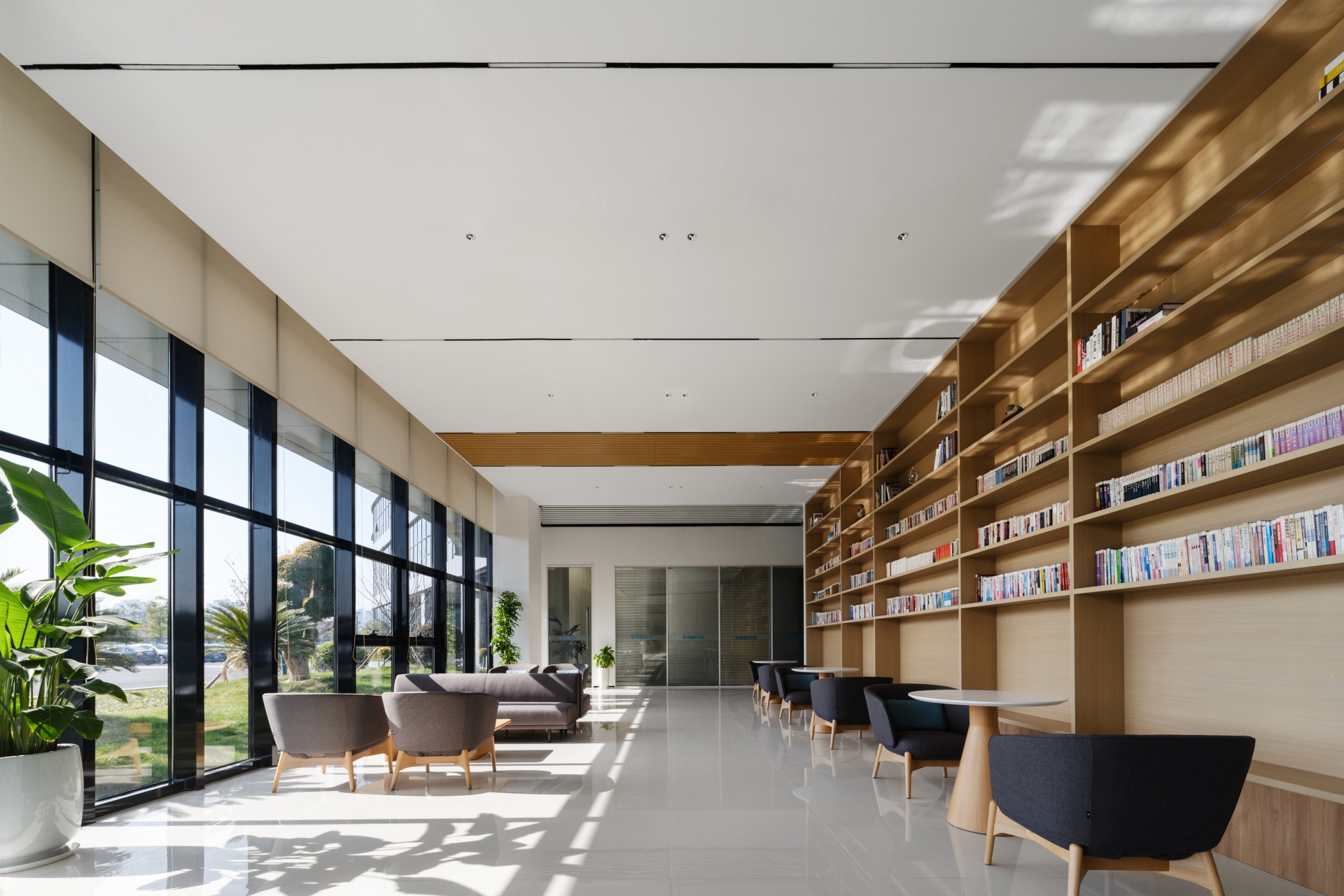 员工食堂:延续绿色主题,色系分明的座椅与绿植幕墙平衡功能与美学,自然光提升用餐舒适度。