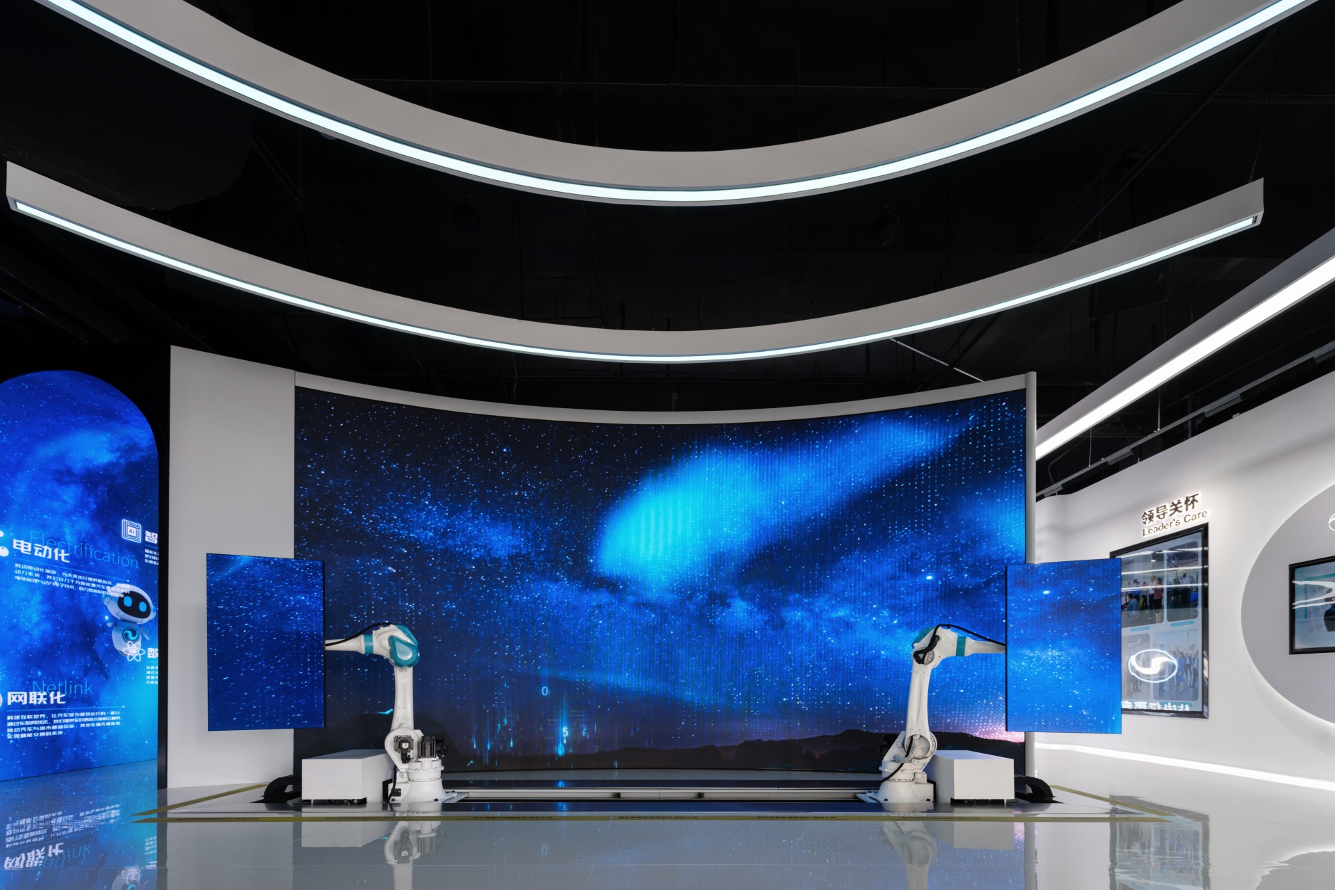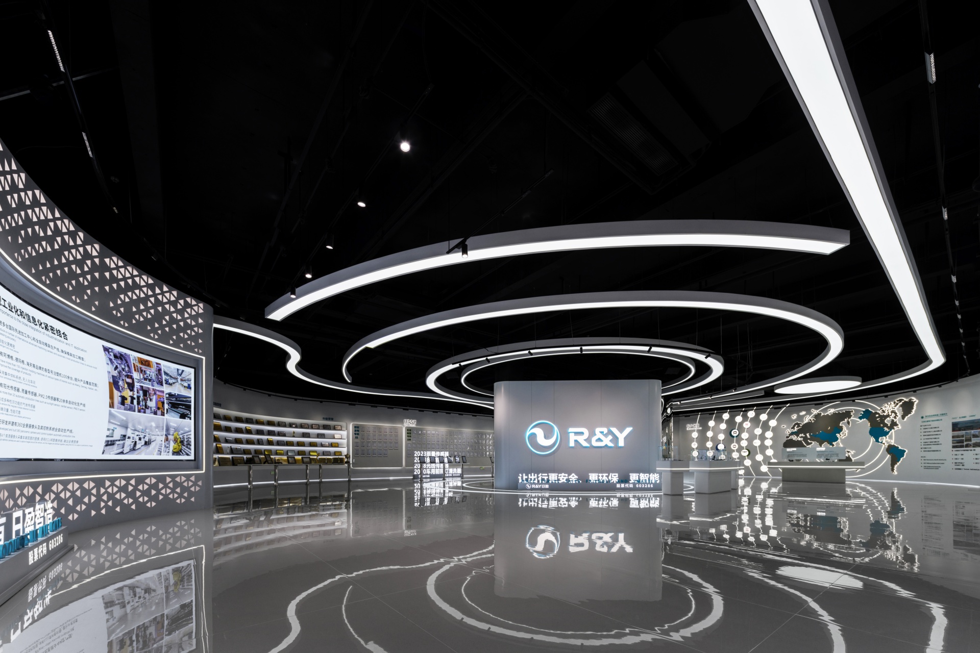 展厅:黑色天幕、曲屏隧道与镜面地砖构成沉浸式科技空间,环形动线串联企业发展历程与荣誉展示,强化品牌叙事。