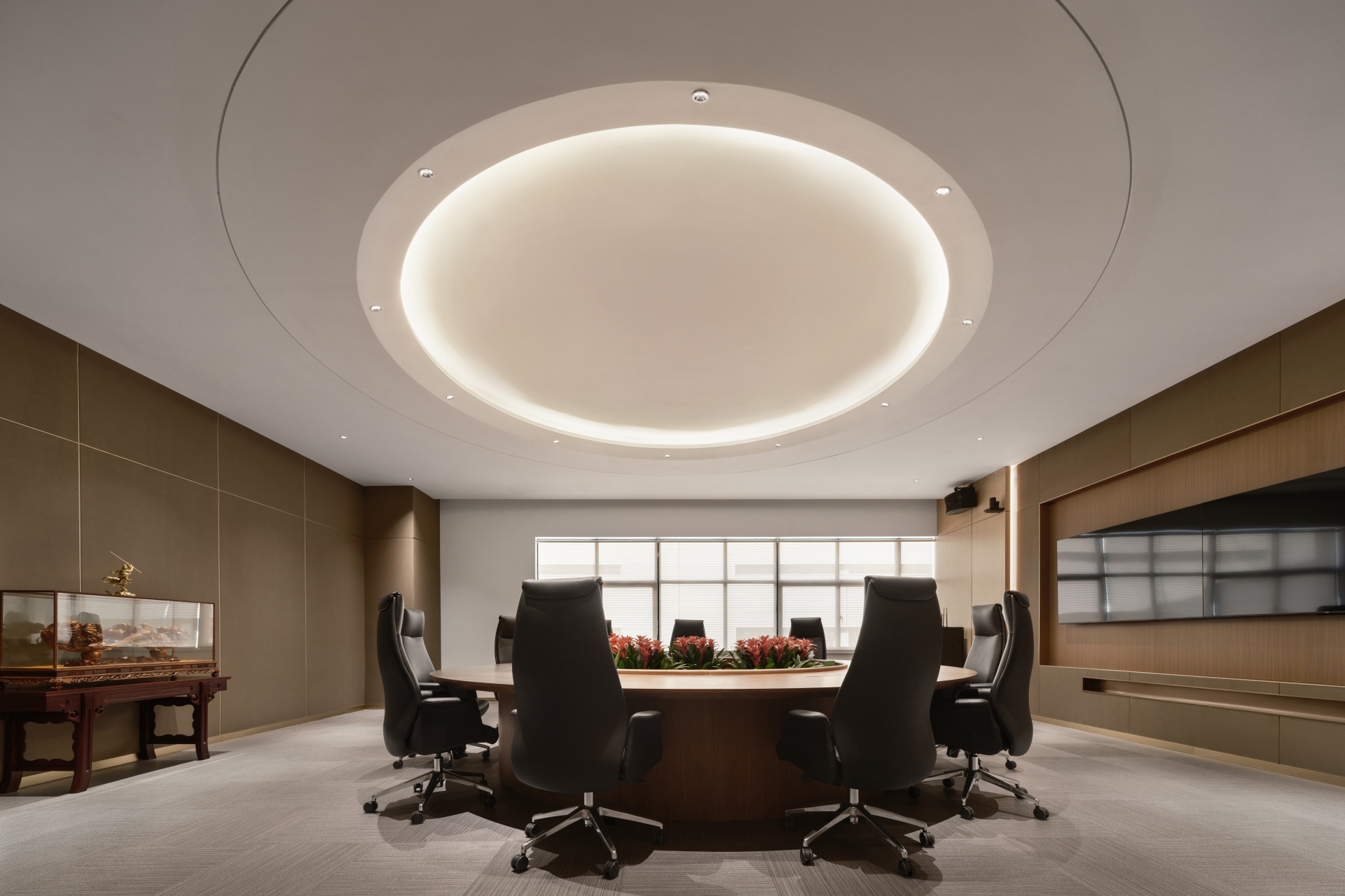 行政办公区:浅色软装与嵌入式储物柜优化空间利用率,银白色会议室以极简设计强化专业属性。