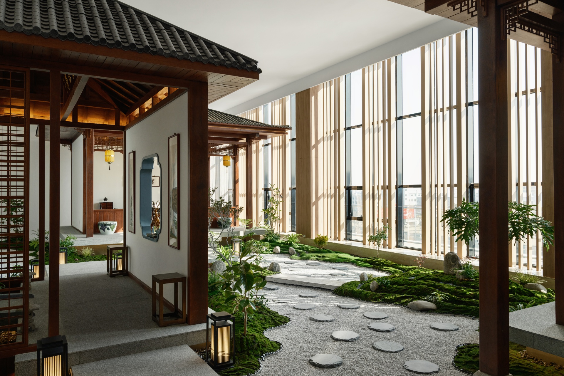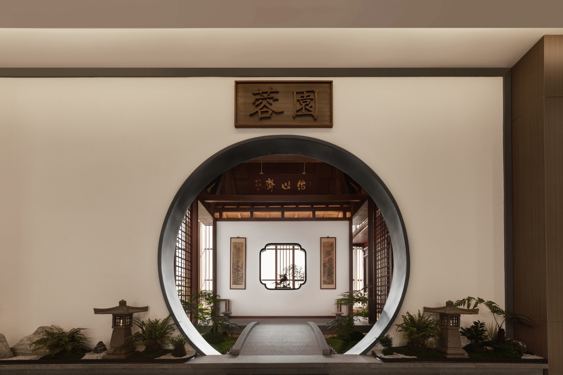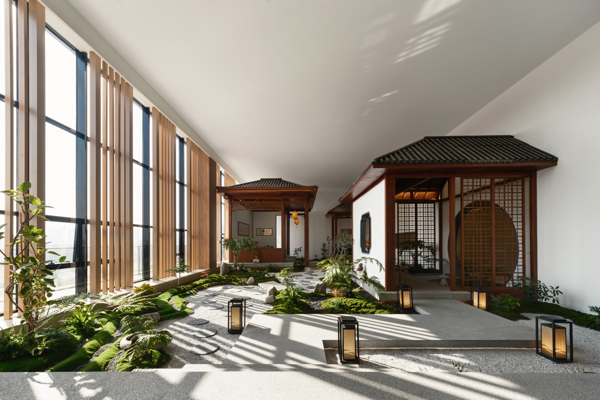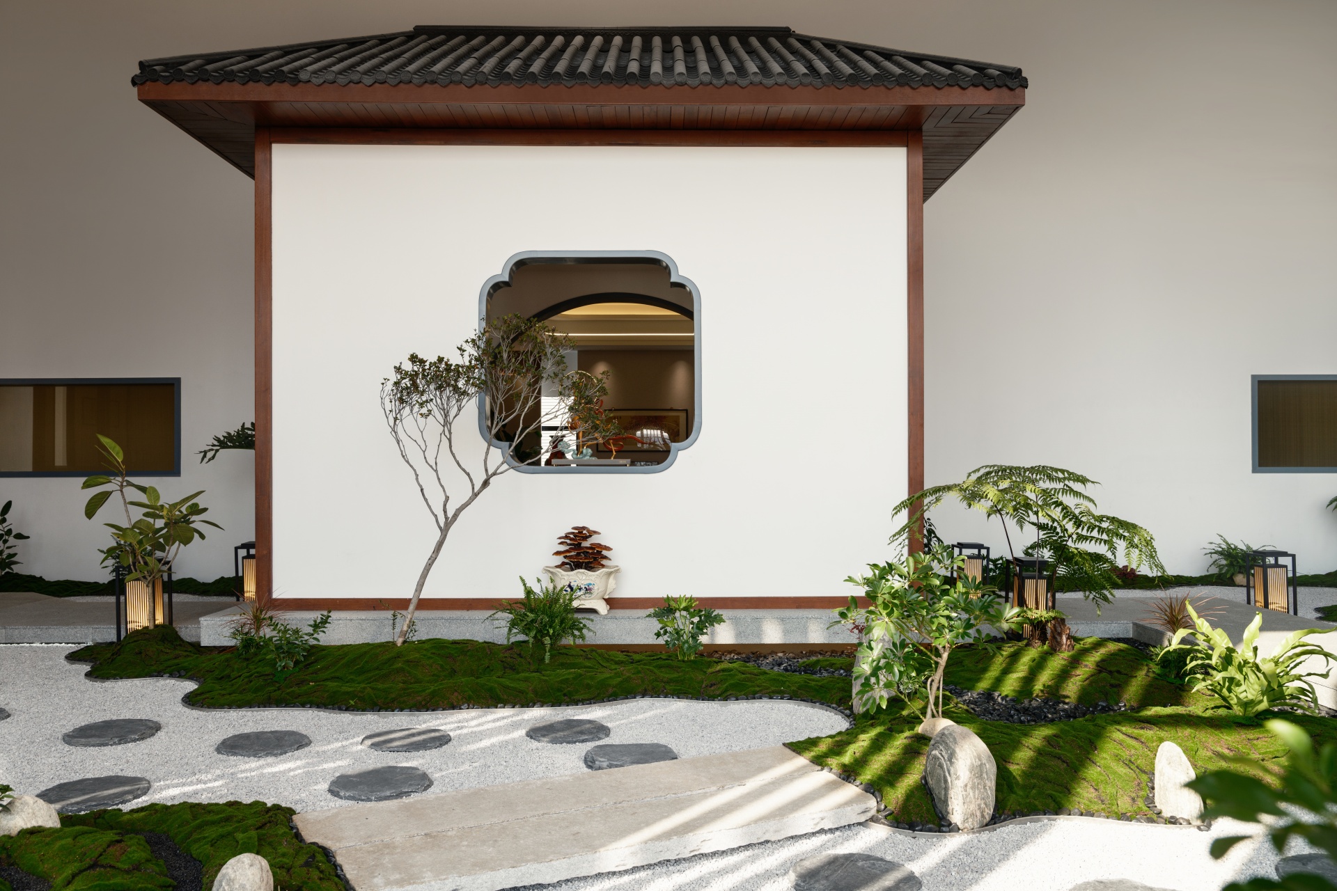 蓉园庭院:仿古木雕、石板小径与悬挑屋檐重构东方园林,木窗光影与绿植亭台营造禅意休憩空间。