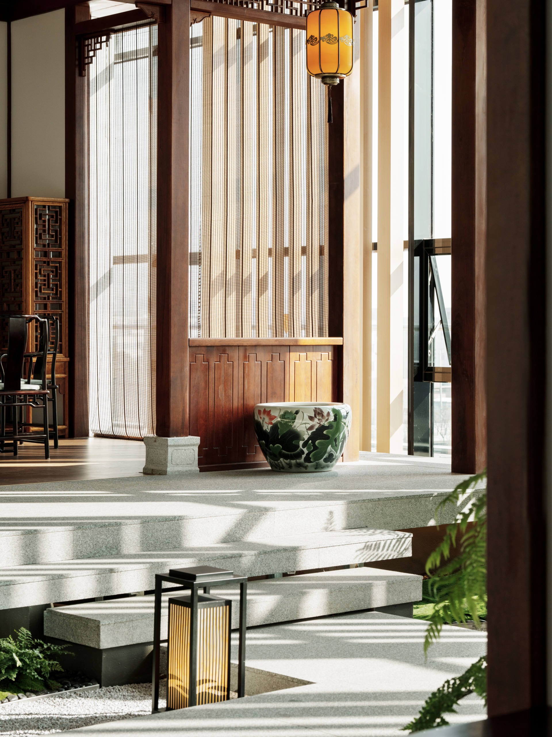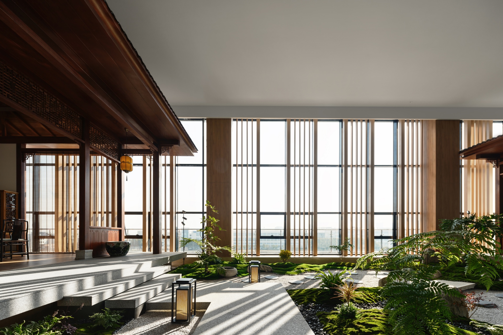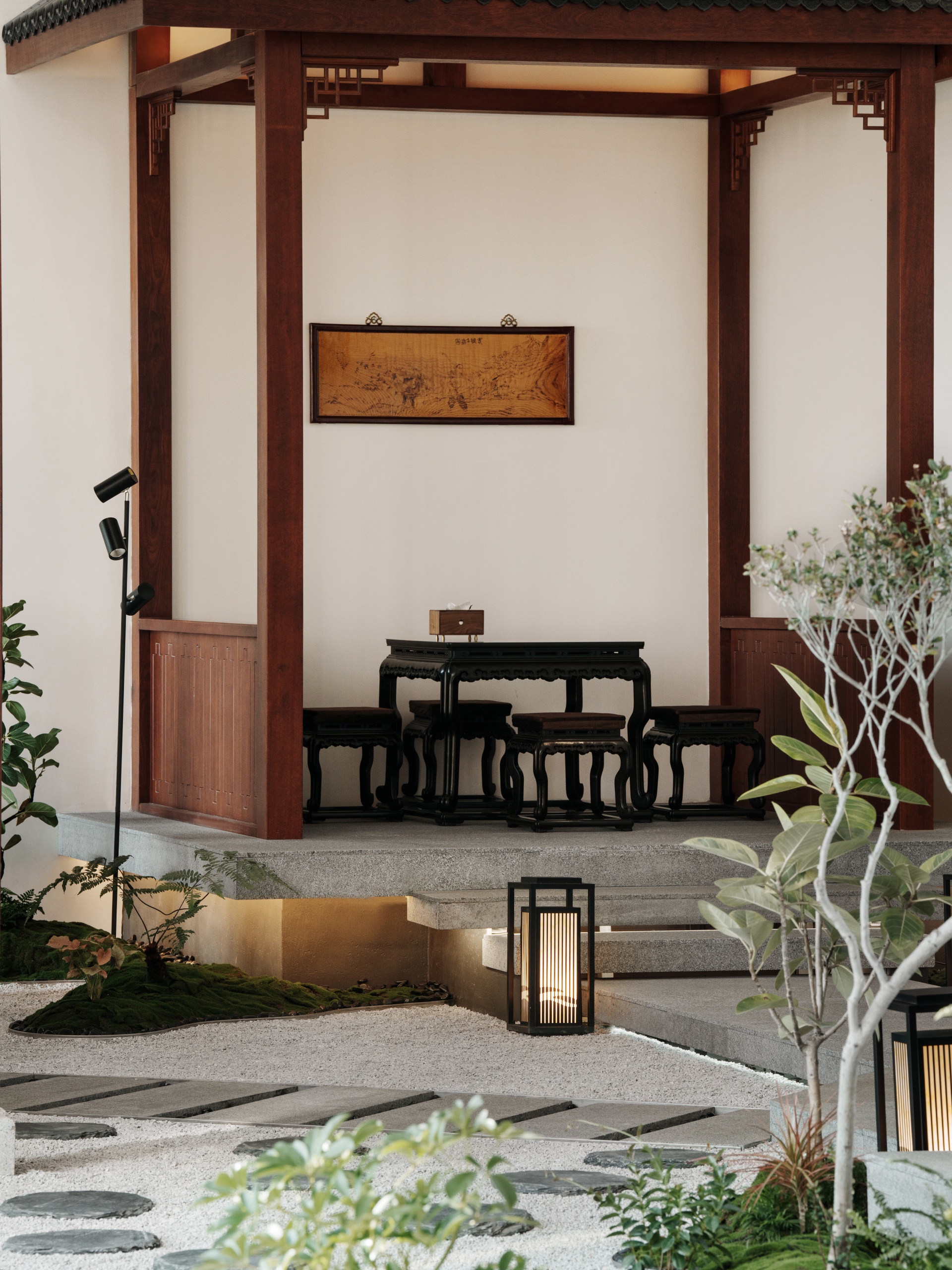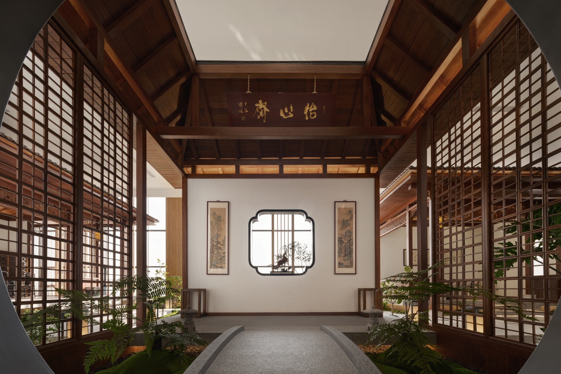 蓉园庭院:仿古木雕、石板小径与悬挑屋檐重构东方园林,木窗光影与绿植亭台营造禅意休憩空间。