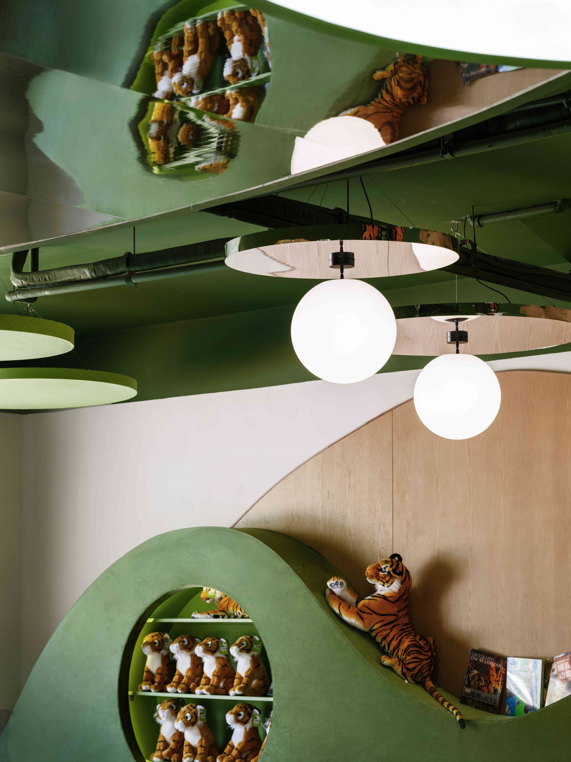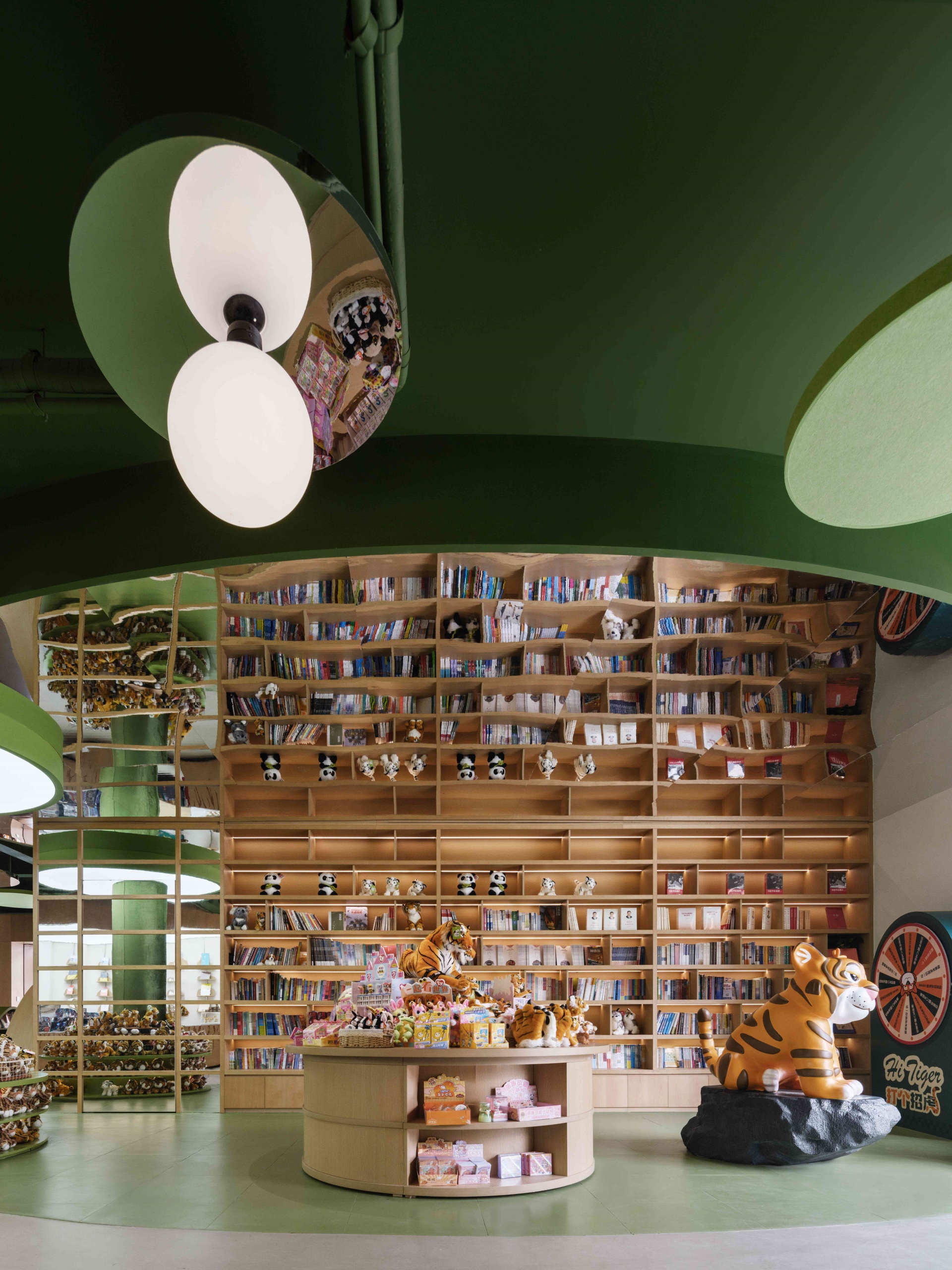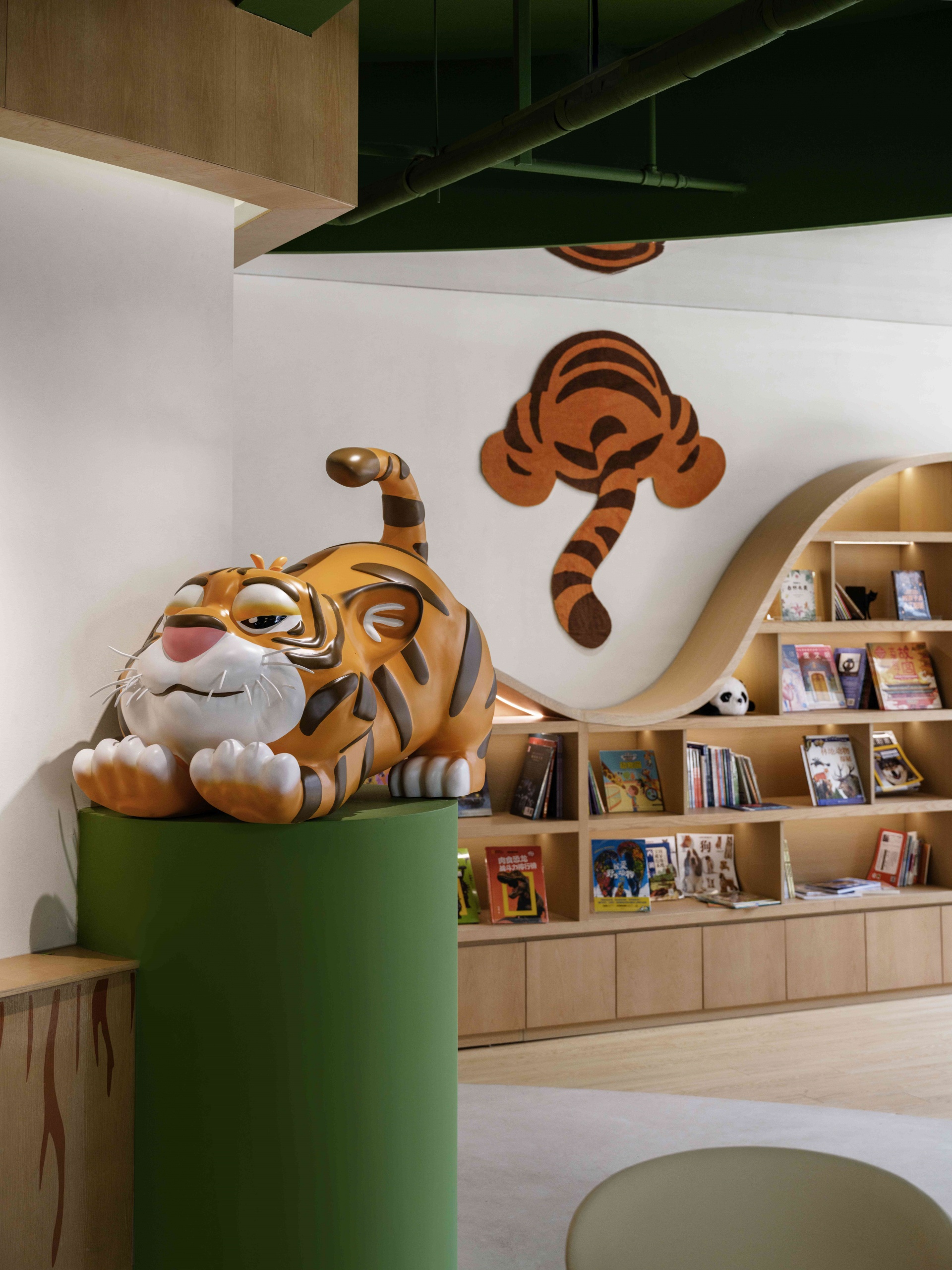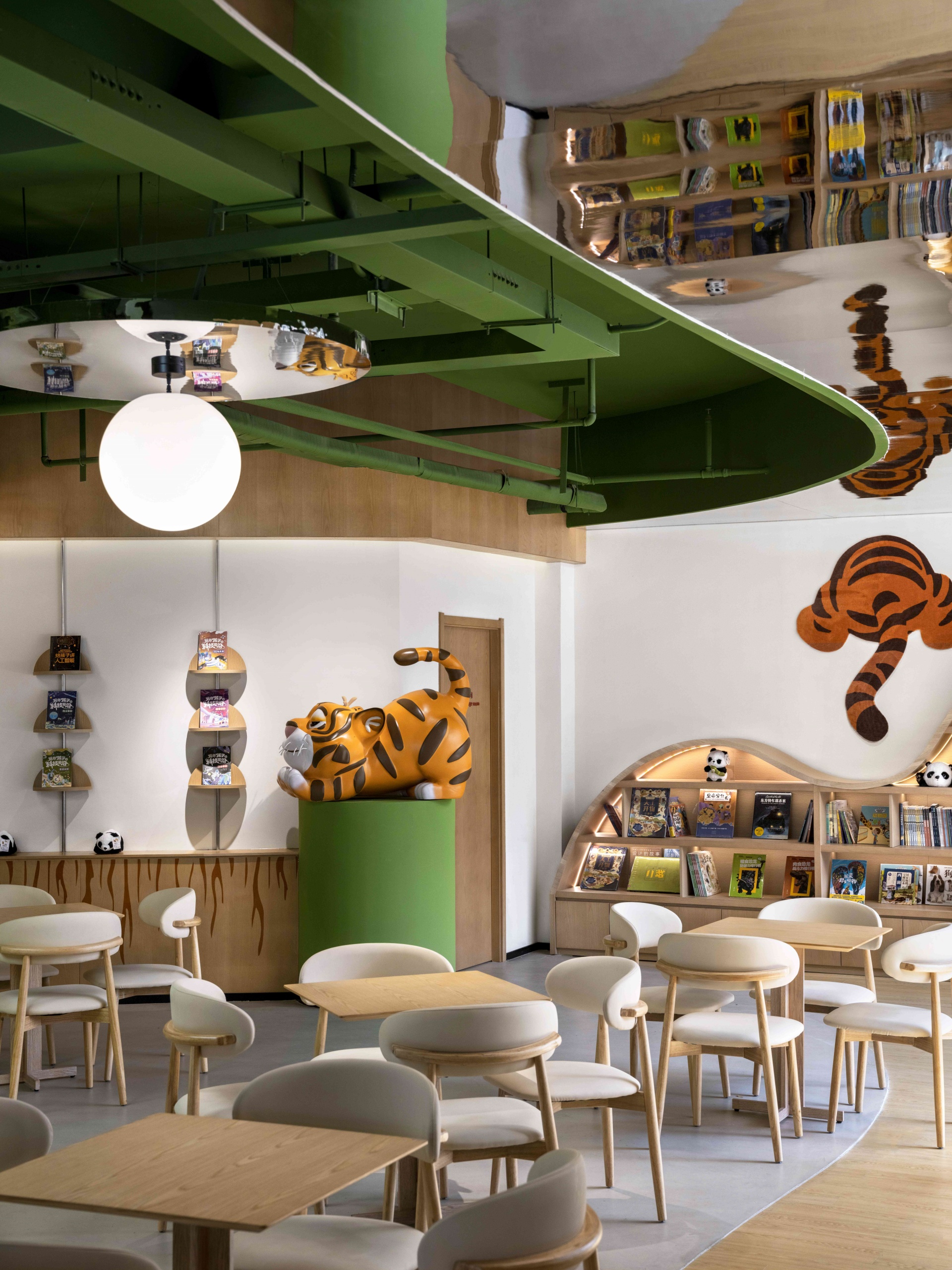 室内以丛林绿为基调,层叠曲线书架似山丘起伏,镜面天花延伸空间纵深感,橘色萌虎IP隐匿于书架、天花之间,与苏作手工艺品、动物绘本共构趣味场景。