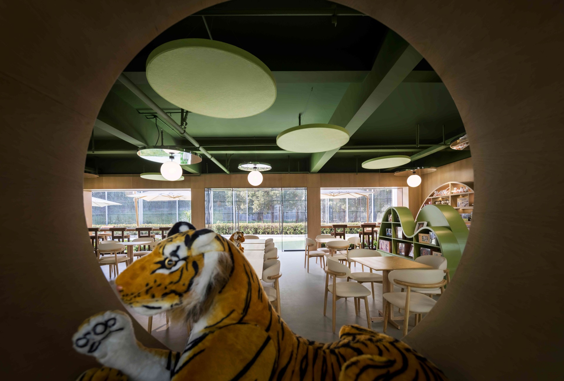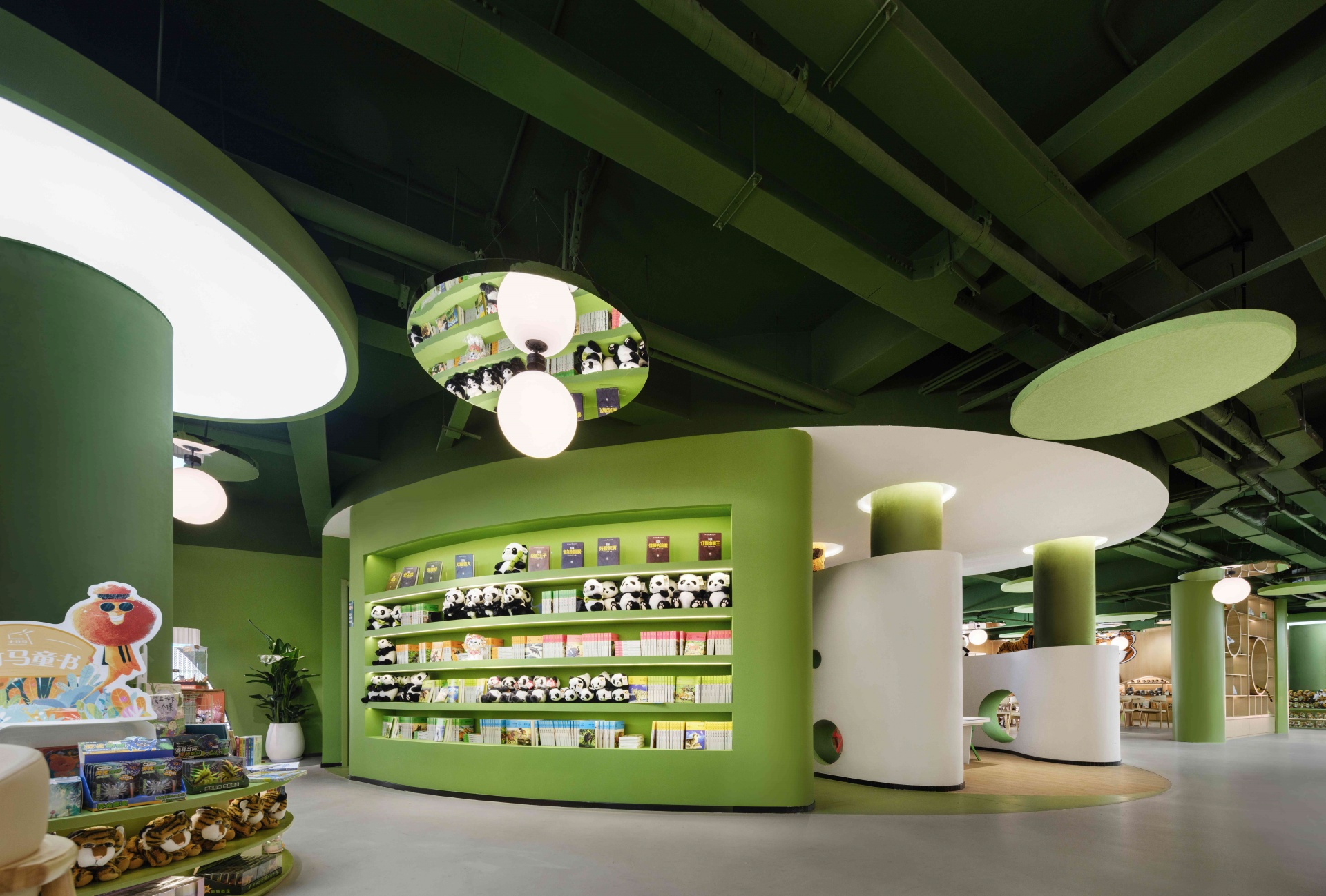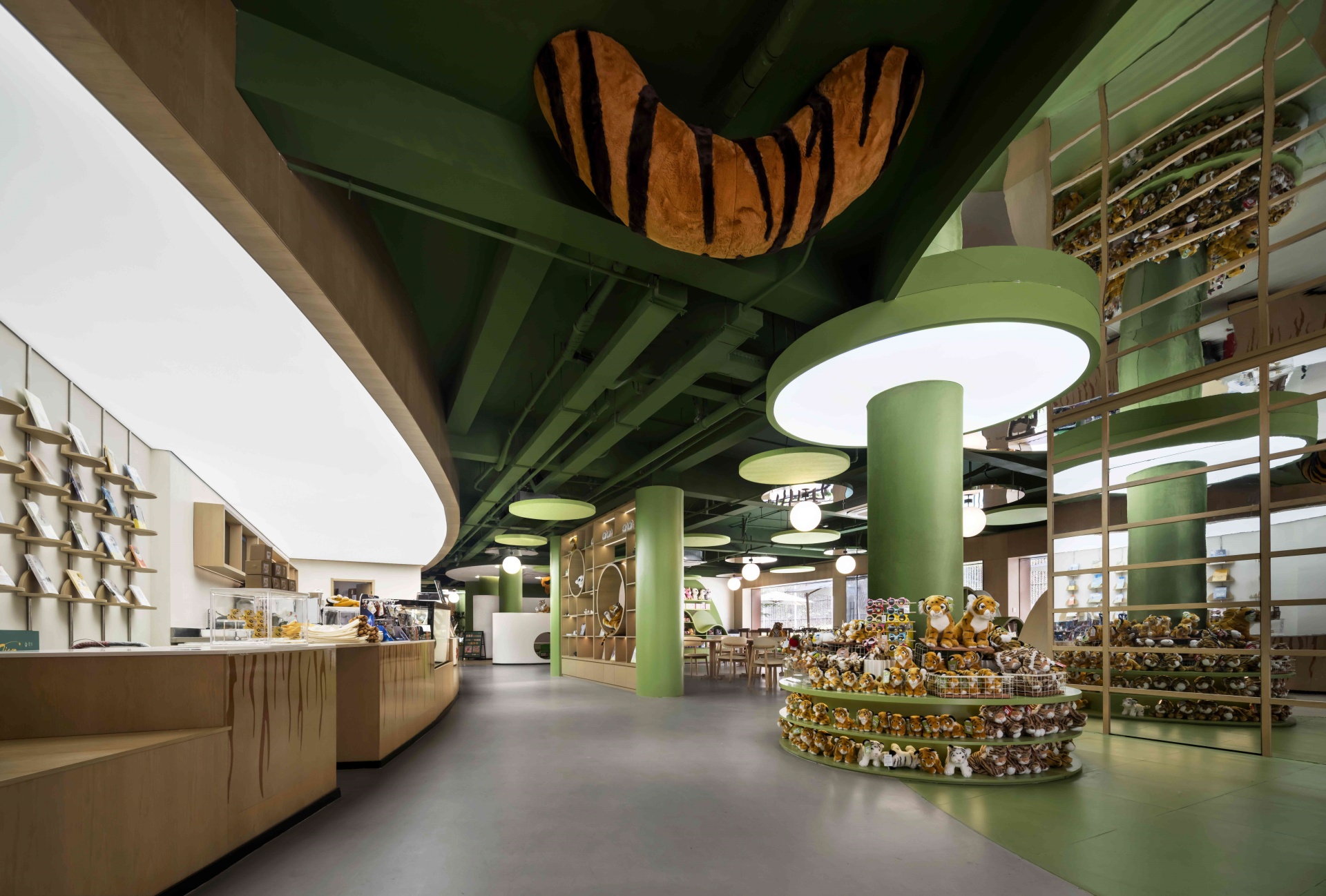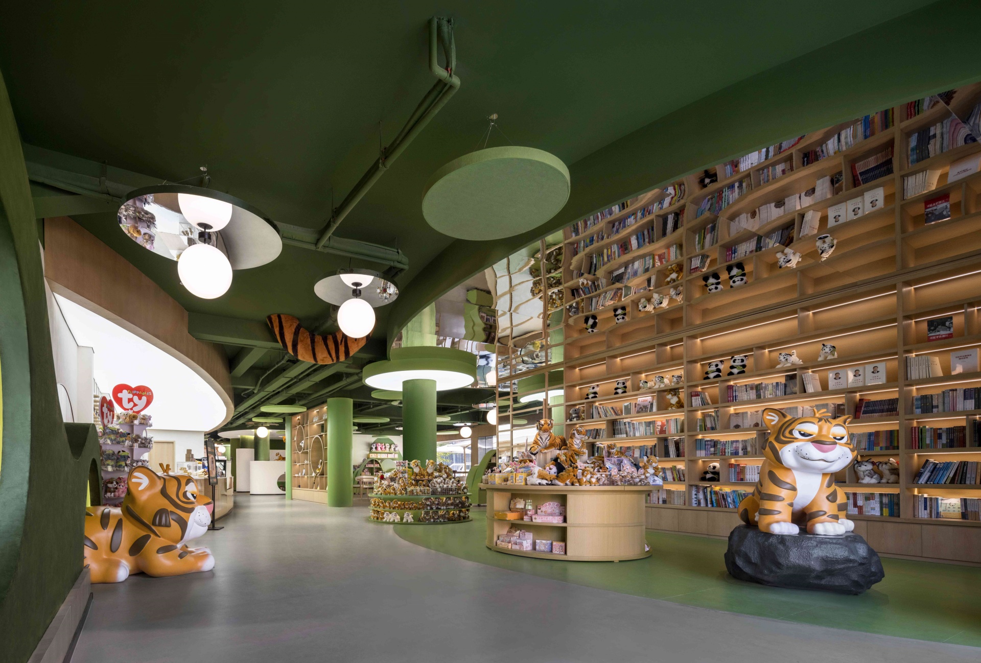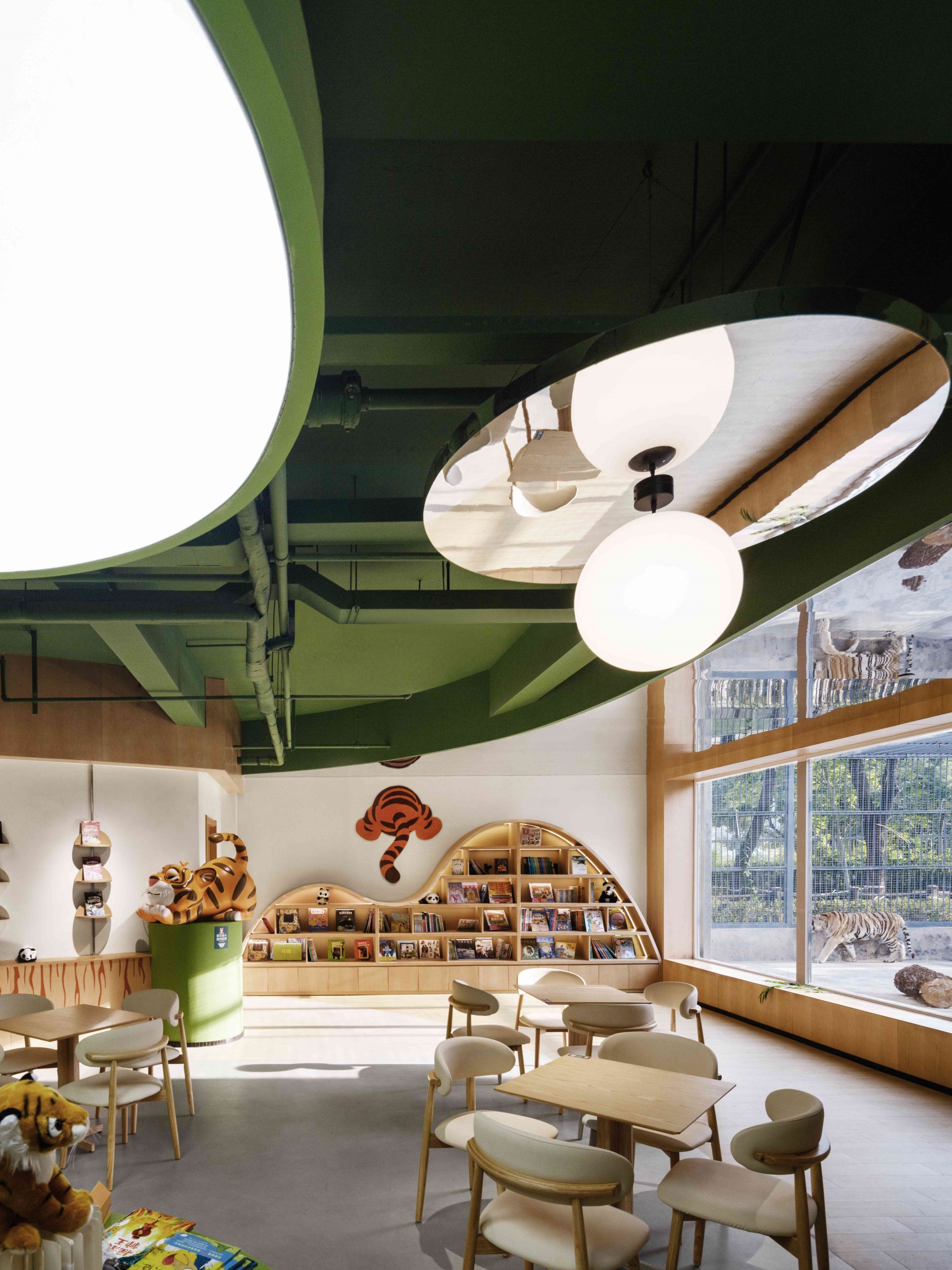 室内以丛林绿为基调,层叠曲线书架似山丘起伏,镜面天花延伸空间纵深感,橘色萌虎IP隐匿于书架、天花之间,与苏作手工艺品、动物绘本共构趣味场景。