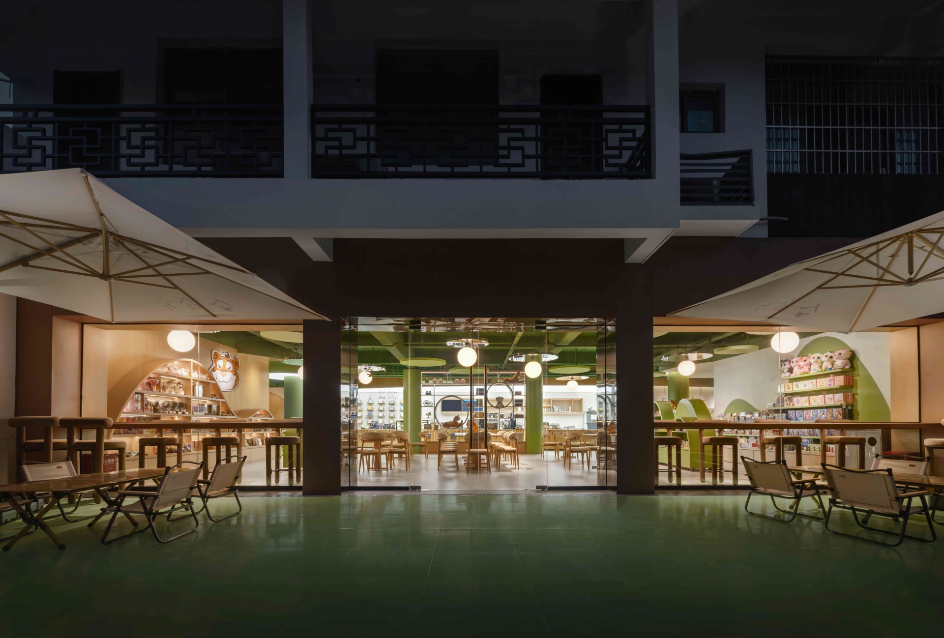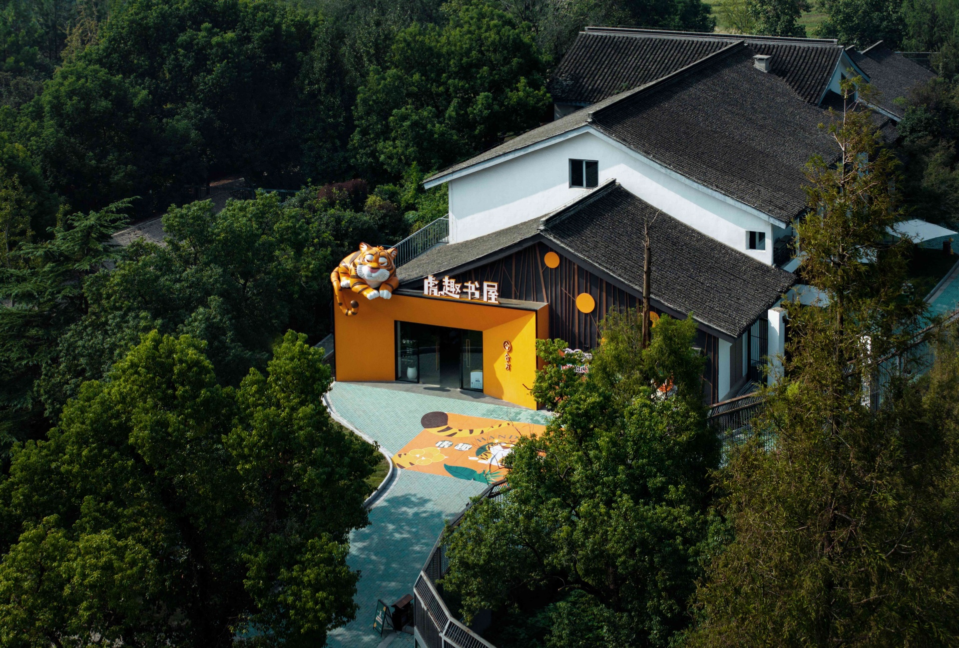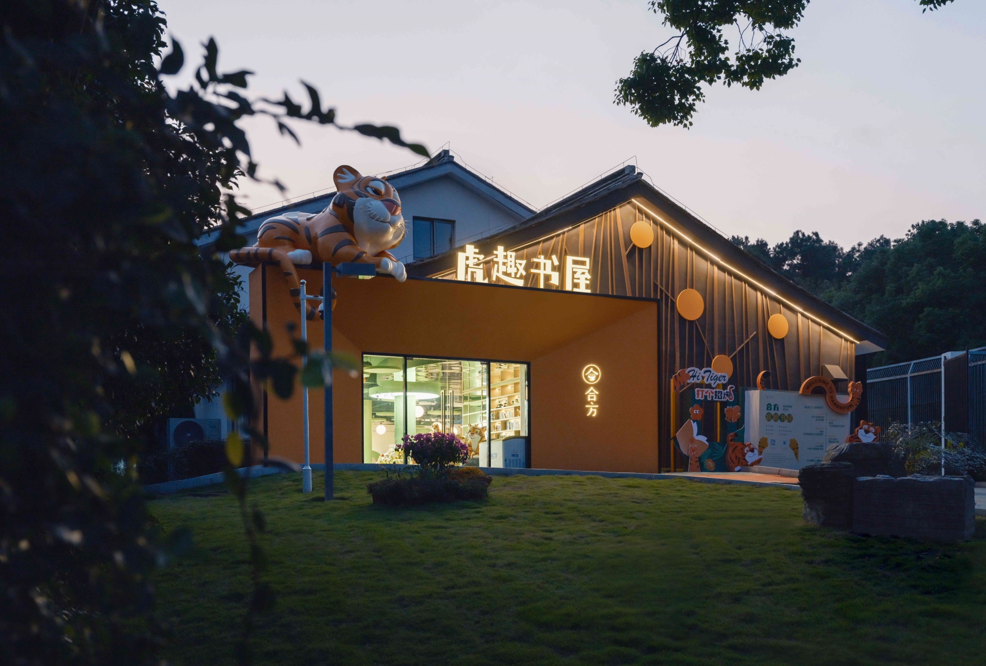 建筑外观以萌虎雕塑点睛,橙白撞色外墙模拟森林树干,与传统苏式屋檐交融,形成“山林小屋”的现代演绎。