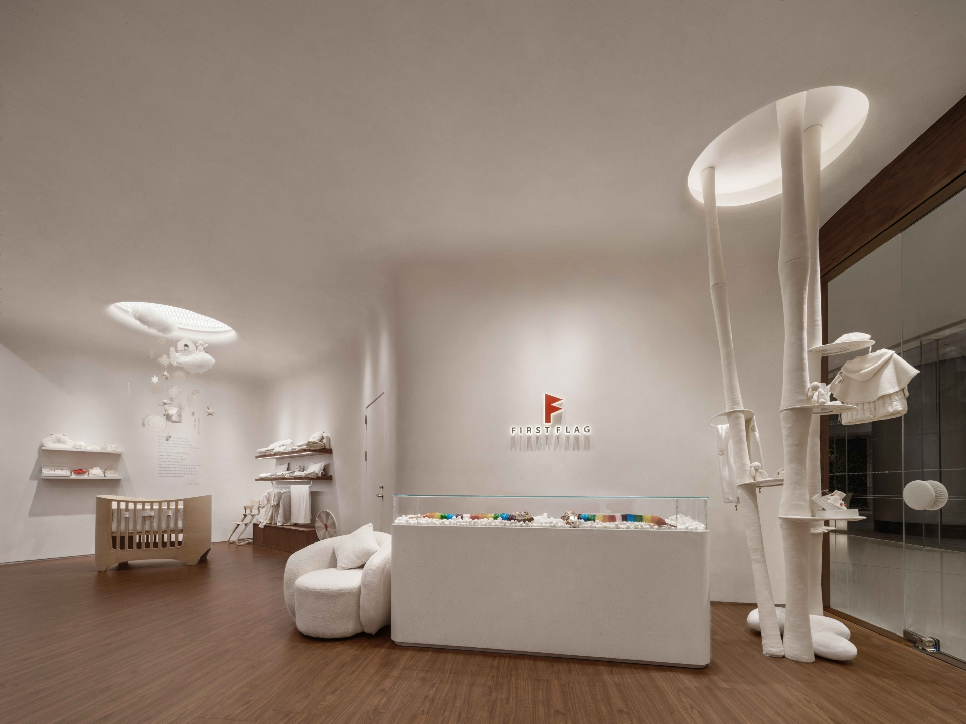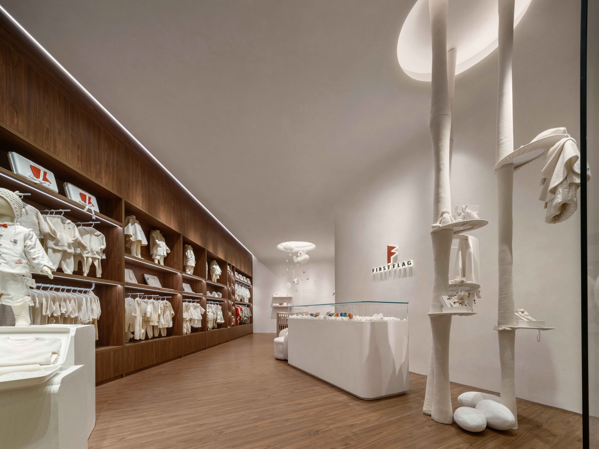 作为品牌艺术总监,原研哉先生为FIRST FLAG设计了旗帜视觉识别标识。此次柒设计与FIRST FLAG合作,为其打造南京&成都旗舰店。配合洁白无瑕的空间,用象征着自然的木质元素展现出生命力,营造温暖的氛围感。