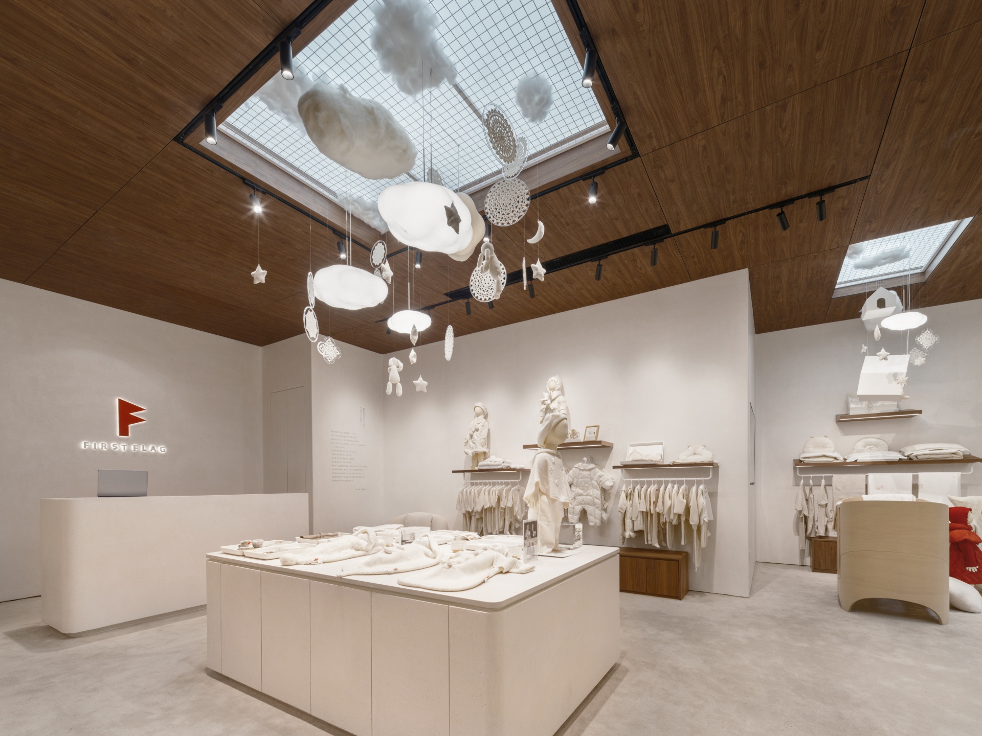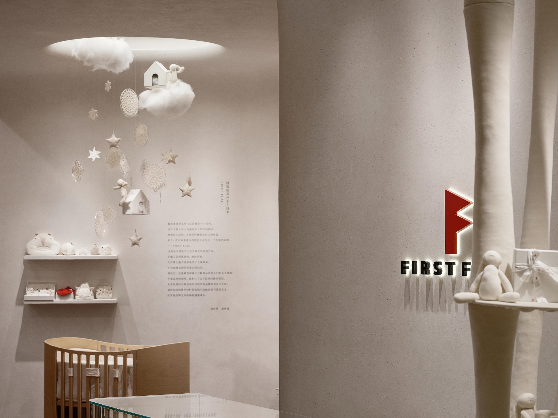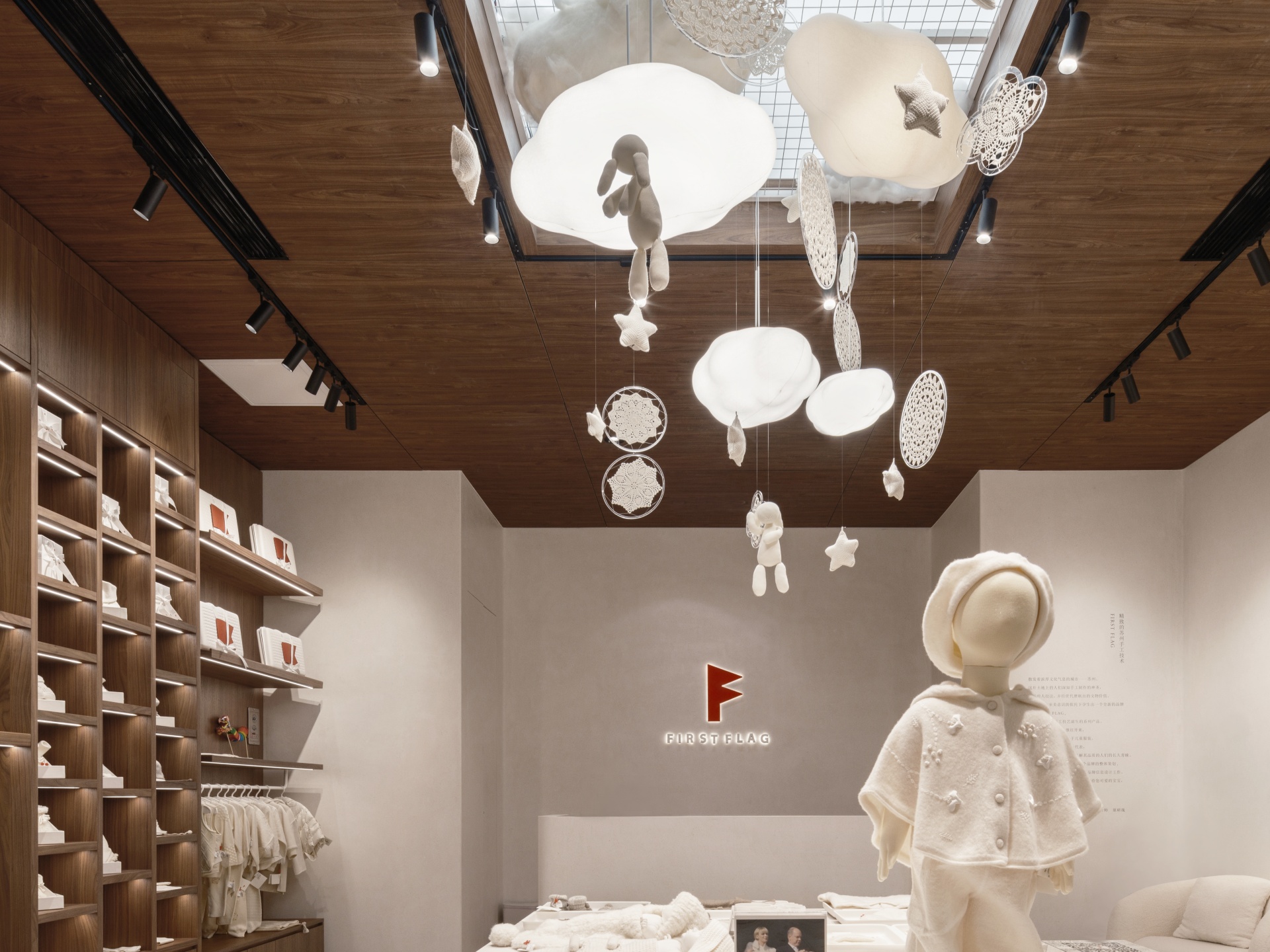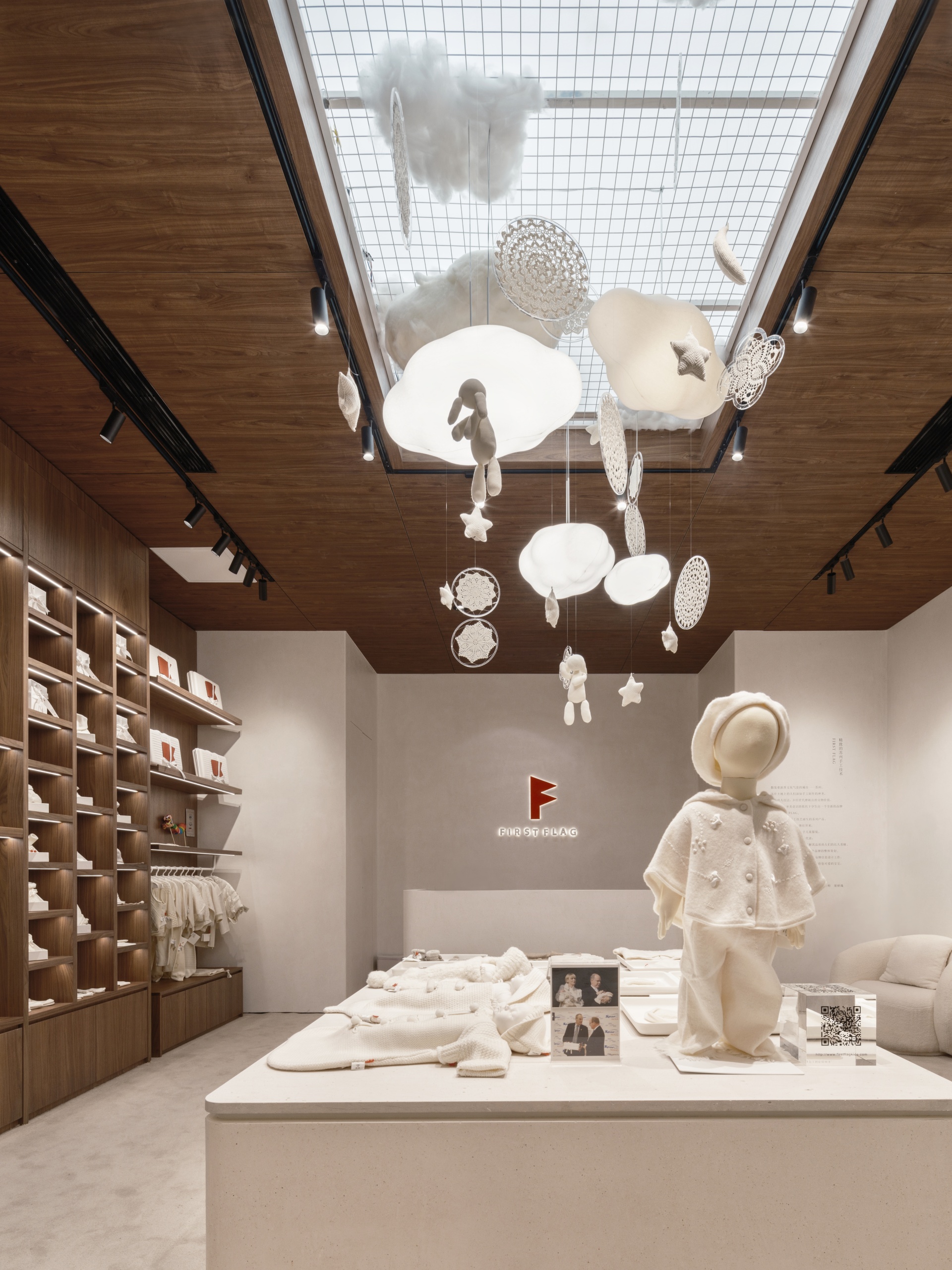 FIRST FLAG南京旗舰店坐落于中山路德基广场,设计亮点在于悬在空中繁复的装饰,云朵灯、小房子以及运用苏绣技艺巧手织造的捕梦网,共同构筑出温馨而诗意的空间。