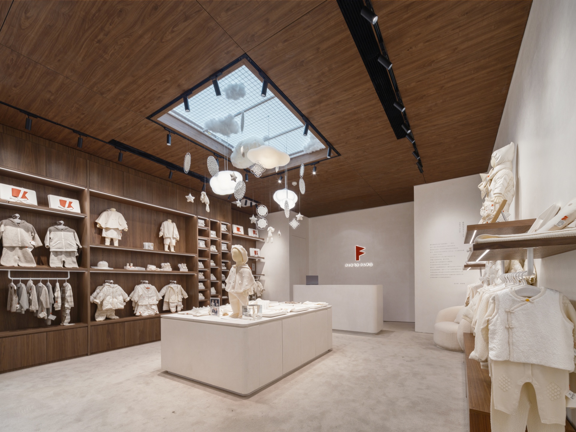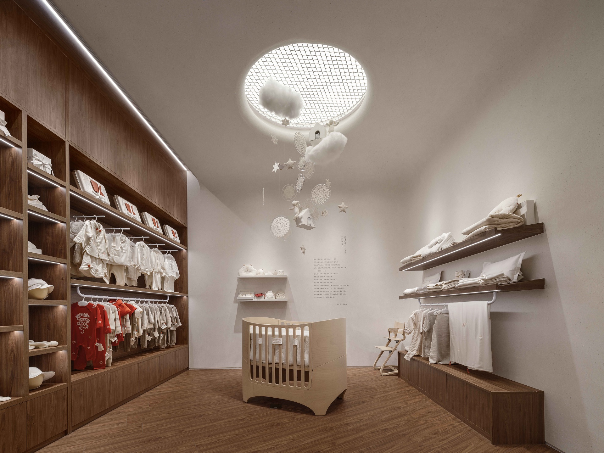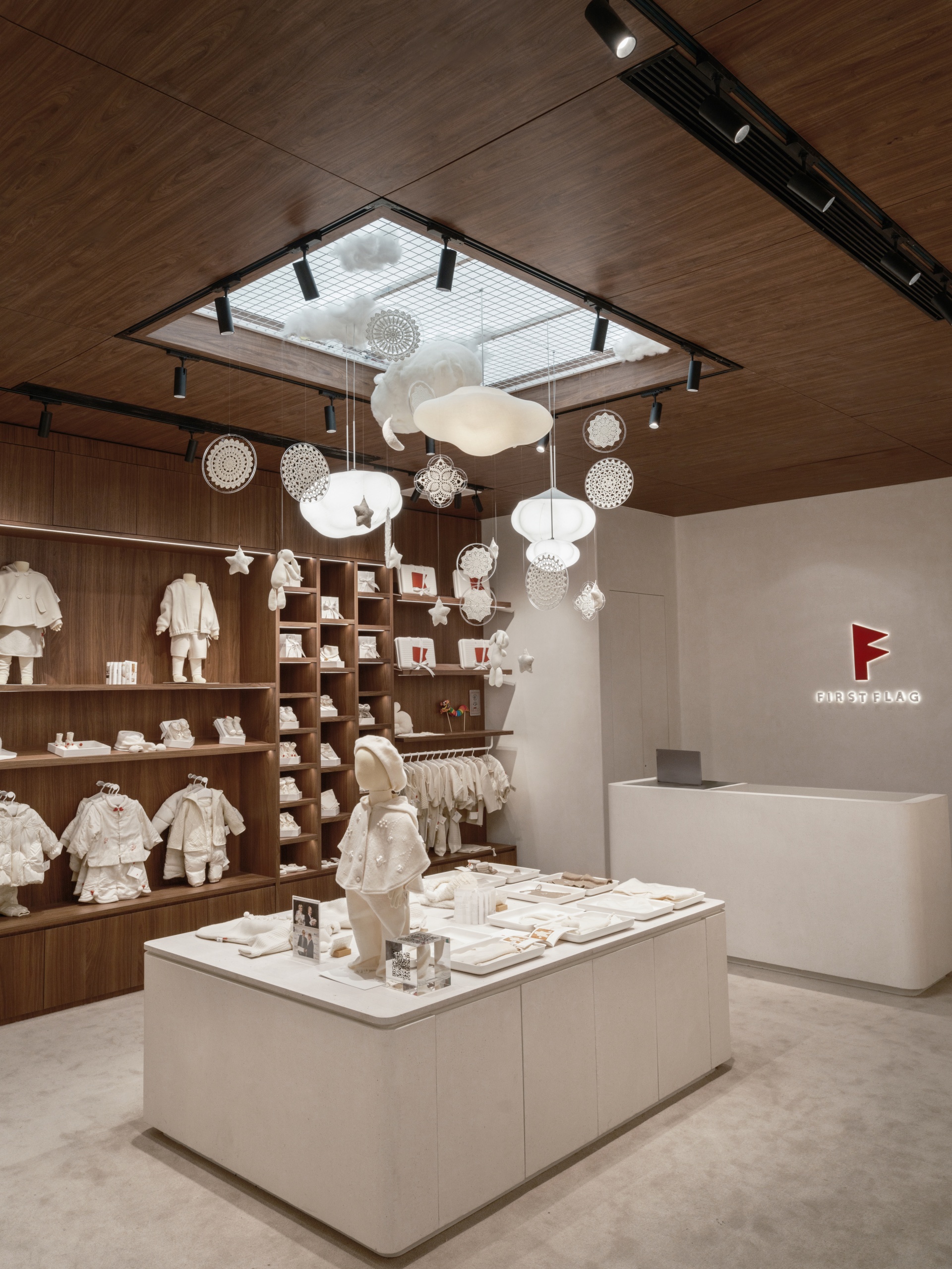 FIRST FLAG南京旗舰店坐落于中山路德基广场,设计亮点在于悬在空中繁复的装饰,云朵灯、小房子以及运用苏绣技艺巧手织造的捕梦网,共同构筑出温馨而诗意的空间。