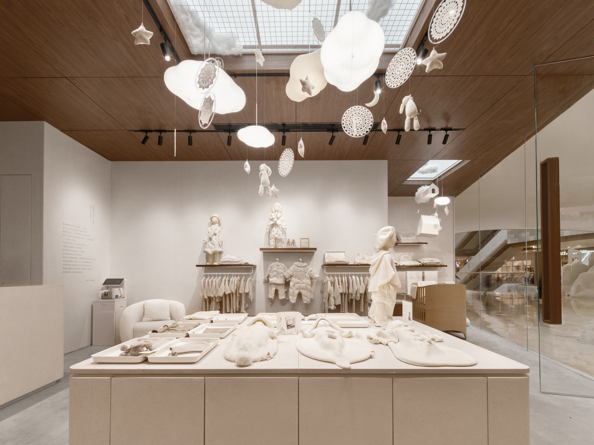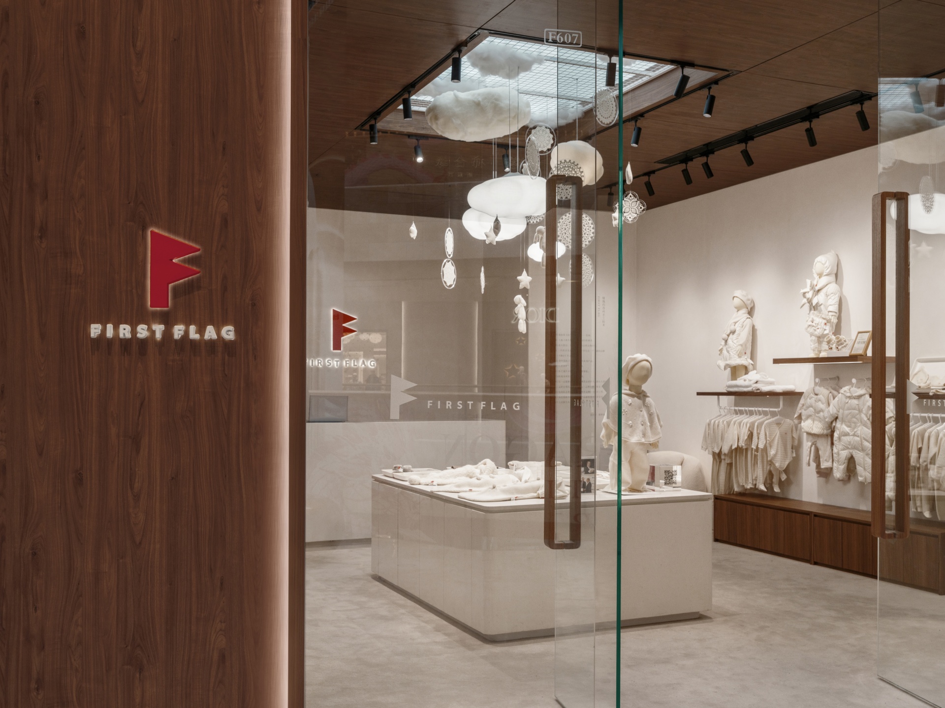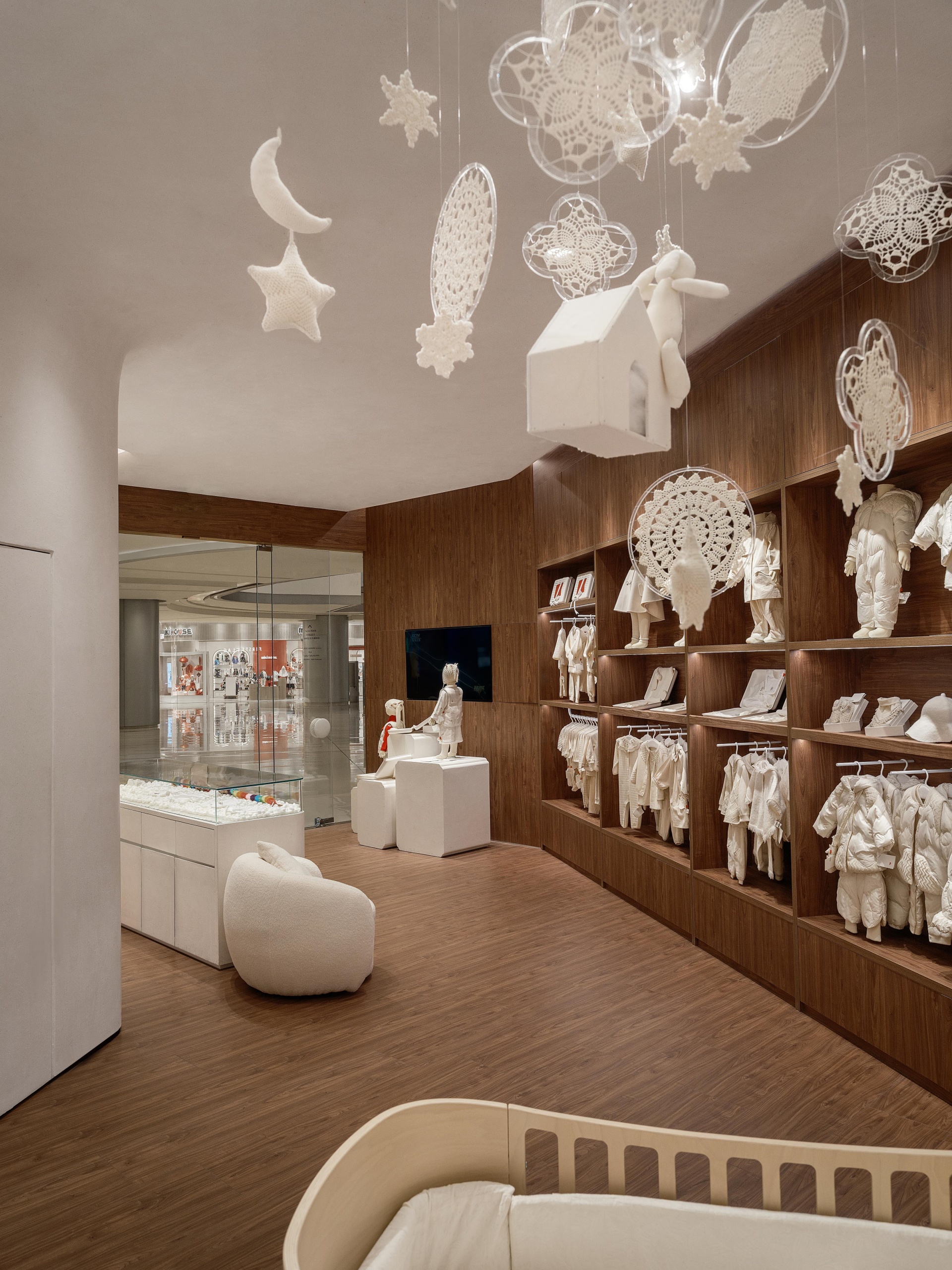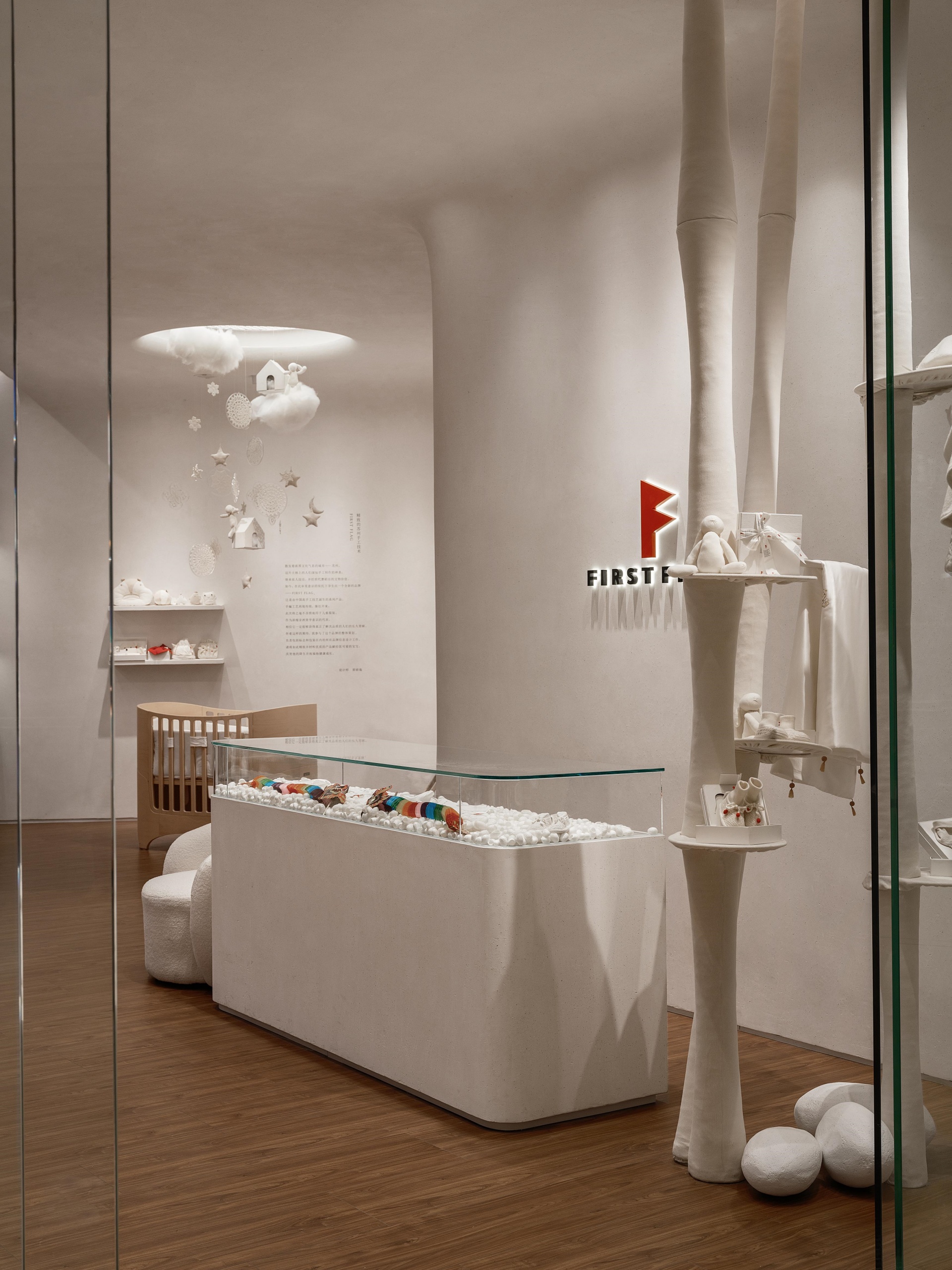 FIRST FLAG南京旗舰店坐落于中山路德基广场,设计亮点在于悬在空中繁复的装饰,云朵灯、小房子以及运用苏绣技艺巧手织造的捕梦网,共同构筑出温馨而诗意的空间。