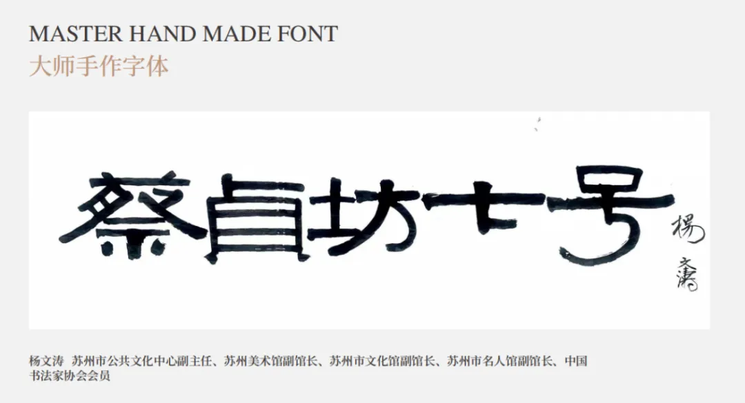 基于苏州市公共文化中心副主任、苏州美术馆副馆长杨文涛先生的题字作品——“蔡贞坊七号”,CHY DESIGN在保留传统书法风格的基础上,结合现代审美以及阅读习惯,以隶书的“形”与“势”,演绎古朴厚重的历史感,呈现“蔡贞坊七号”的温度感与人情味。