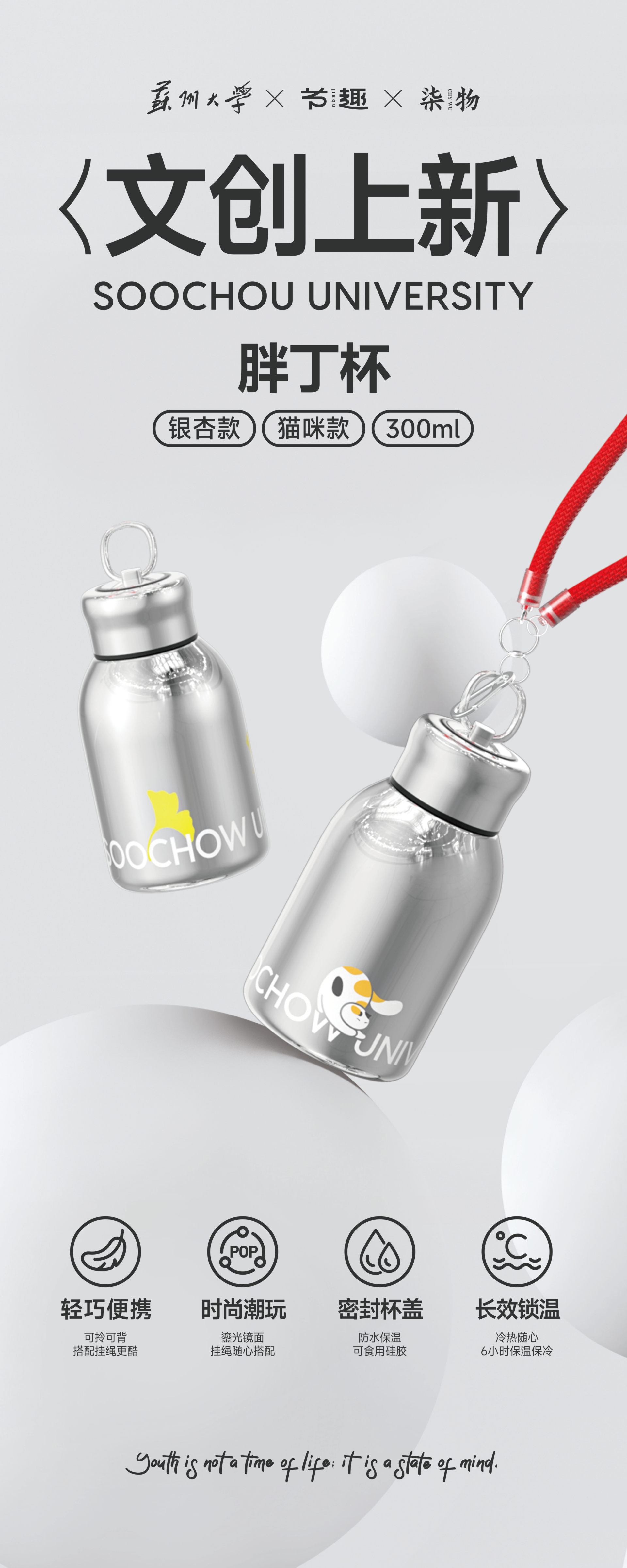 胖丁杯灵感源自校园网红猫“坨坨”,造型圆润俏皮,另有银杏杯以不锈钢底配亮眼黄色点缀,搭配红色提绳,兼具时尚与便携。
