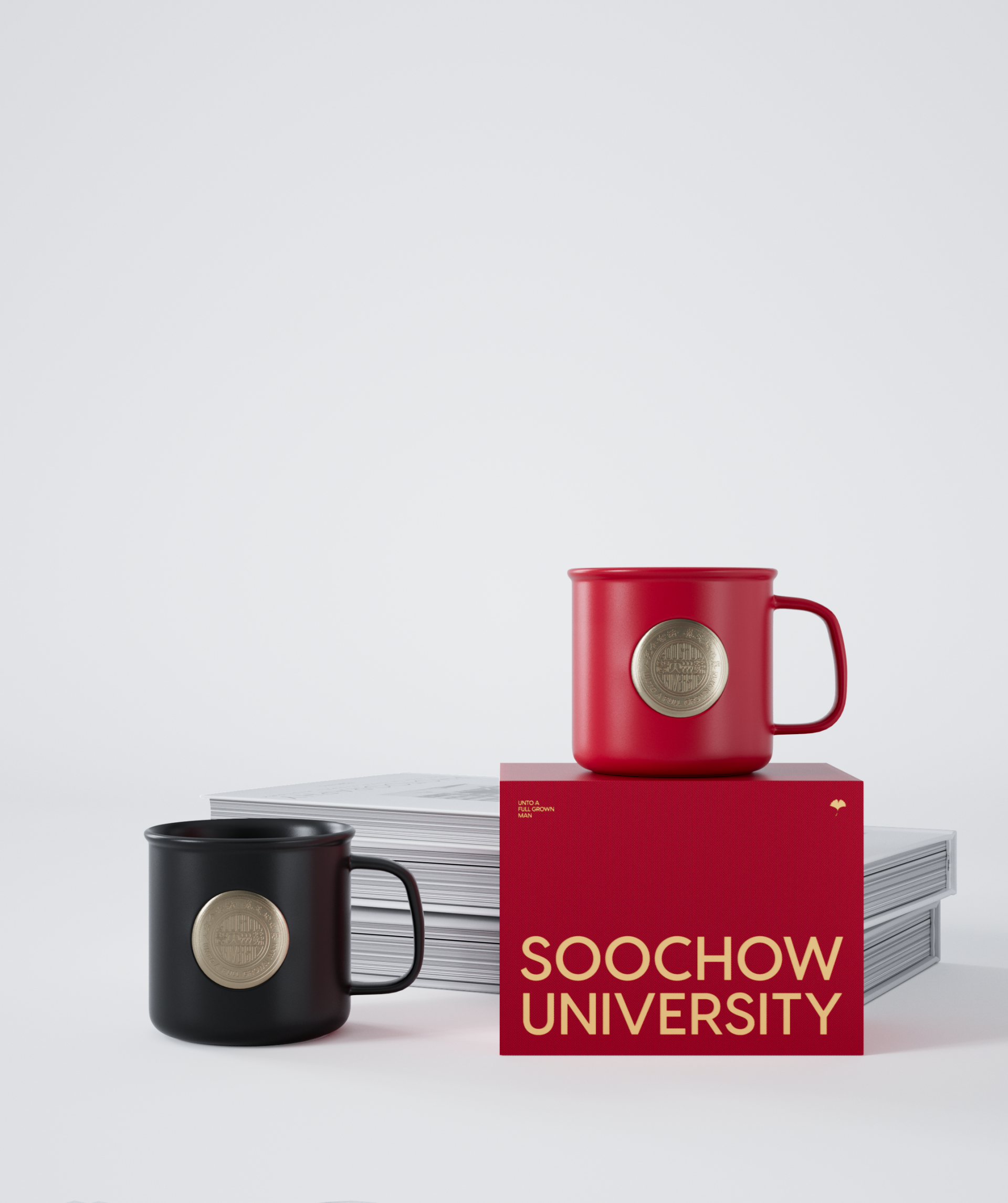 滤杯采用316不锈钢配微磨砂白釉,分别刻画钟楼红金花纹与东吴大学旧址大门线条,内置可拆卸茶滤及便携结构,包装结合AR技术呈现校园3D影像,实现古今交织。